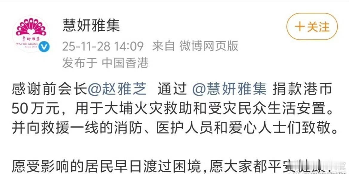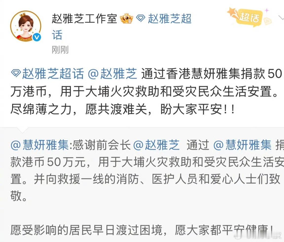 赵雅芝为香港捐赠50万港元今天下午赵雅芝通过香港慈善团体“慧妍雅集”捐赠50万港元!支援香港大埔火灾救助和受灾民众生活安置。芝姐人美心善,盼平安!