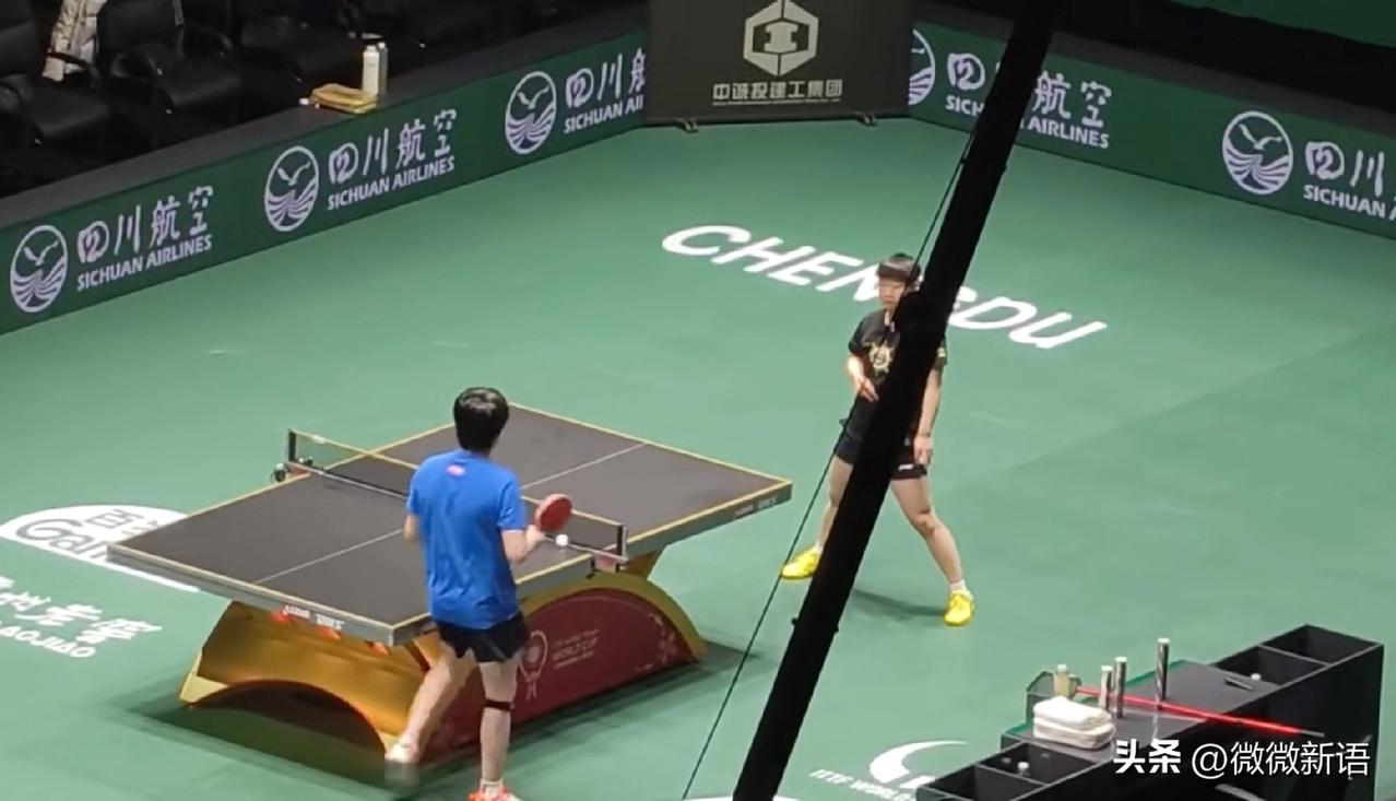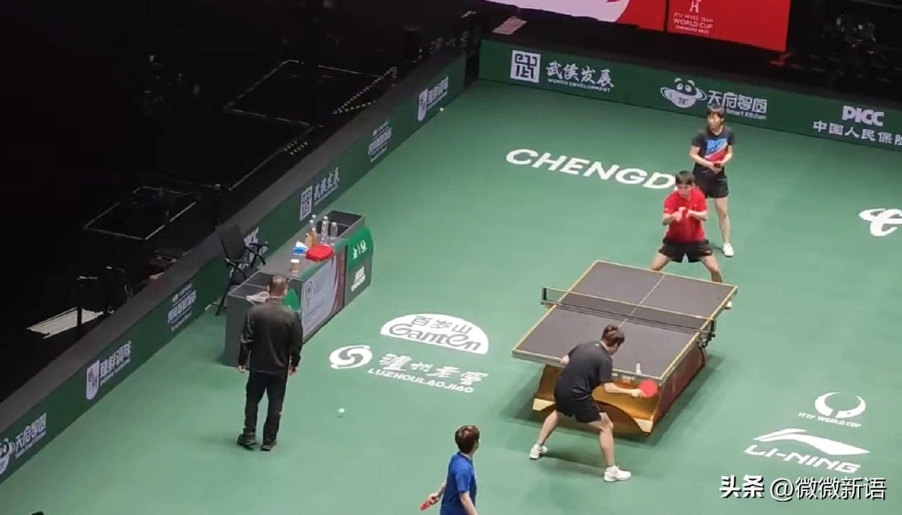 莎头组合已经对练上了。 前天看到莎头组合拿到WTT香港总决赛混双外卡,今天就看到他俩在比赛场馆已经开始对练了,这次成都混团的比赛,他俩肯定是要上混双的,具体哪一场会派他俩上,就不知道了。因为总决赛林诗栋/蒯曼也要参赛,两对混双肯定都要以赛代练,后面没有时间专门训练了,成都混团的比赛结束后,就是总决赛。 莎莎和王楚钦对练的时候,看到袁队医坐在场外,孙逊教练拿着一块挡板放另一边了,没有看到肖导。今年成都混团比赛一共有两张球台,在另一个球台看到林诗栋和梁靖崑在对练,蒯曼和王曼昱在旁边看,应该他俩练完她俩练吧,马琳在旁边。 明天下午就是成都混团的抽签仪式,看到说是王楚钦、王曼昱出席抽签仪式,后天比赛就要开始了,大家也都在积极备战中,又可以看到莎头的混双比赛了,开心。