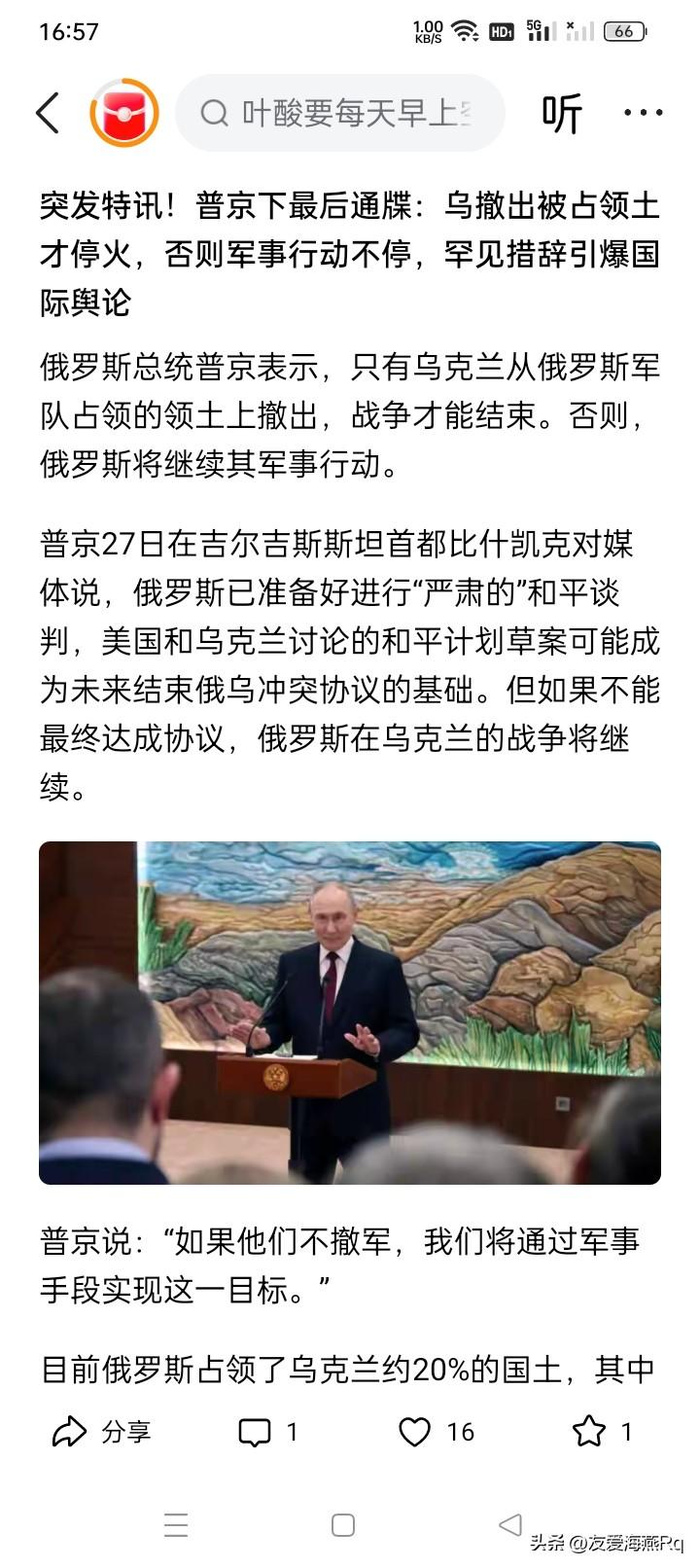 所有信息都指向一个字:打! 现在的乌克兰战争,实际上就是:凡是俄罗斯同意的结束战争的条件,乌克兰似乎都不会同意;凡是乌克兰同意结束战争的条件,俄罗斯又似乎也不可能接受。 然而,不知道那些四处奔波,千方百计筹划停战协议的人,费尽口舌,搜肠刮肚,搞出来的都是一堆又一堆废纸。难道他们不清楚目前的这种情况吗?他们究竟是图个什么呢?这还不仅仅是现在,在过去的几年中,这种状况好像一直是都是如此,没有任何实际上的根本变化。 在这里不谈公平正义,也不谈是非曲直,以及谁对谁错,仅仅只是谈目前的客观事实,当然,最终估计肯定是会有人付出巨大代价。听人劝吃饱饭,但他们不听人劝,愿意饿肚子,又有什么办法呢? 自作孽不可活!