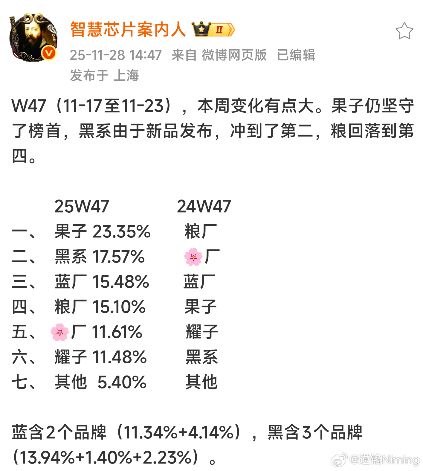 本周果子依然一骑绝尘,黑厂发新品,蓝厂和小米还挺稳的,剩下的就有点掉队了