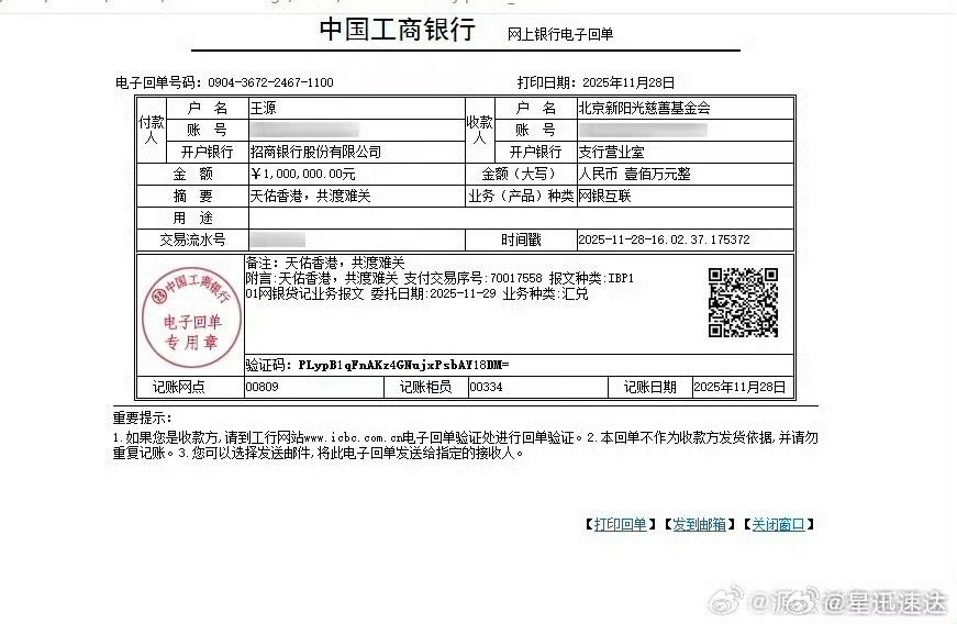 王源为香港捐赠100万王源捐款100万元王源个人捐赠100万元用于灾区救援及民众