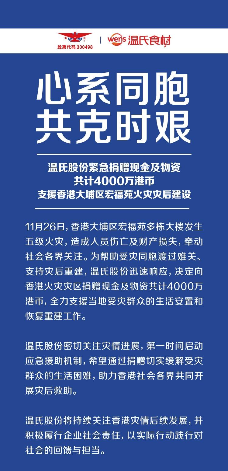 香港发生火灾后,很多企业也艺人都是纷纷捐款捐物,再一次彰显了一方有难八方支援的精神,捐款的企业不少,很多大家都非常熟悉,像阿里巴巴,安踏,字节跳动等等,但有一个企业捐了4000万,很多人连名字都没见过,它就是温氏集团,我刚看了一下企业微博,点赞量特别少。我也是第一次听说温氏集团,它竟然还是上市公司,太低调了。为有爱心的企业点赞![赞][赞][赞]