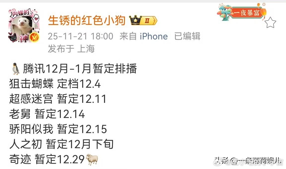 年底排播剧名单出来了,这么一看腾讯和爱奇艺积压剧太多了,跟开闸泄洪似的。看着都是大成本制作,一般都是一个月一部,结果爱奇艺一个月7部,腾讯一个月播6部。白宇、胡歌《奇迹》热门S+张若昀、马思纯《人之初》超级S+宋威龙、赵今麦《骄阳似我》高阶S+郭京飞、王佳佳《老舅》热门S+杨旭文、杨志刚《唐诡奇谭》悬疑S+虞书欣、何与《双轨》现偶S+谭松韵、侯明昊《逍遥》玄幻S+任嘉伦、蓝盈莹《风与潮》年代S+
