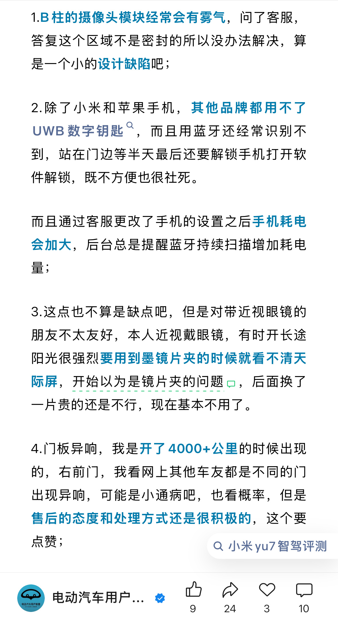 小米车主:4.门板异响,我是开了4000+公里的时候出现的,右前门,我看网上其他车友都是不同的门出现异响,可能是小通病吧,也看概率,但是售后的态度和处理方式还是很积极的,这个要点赞;