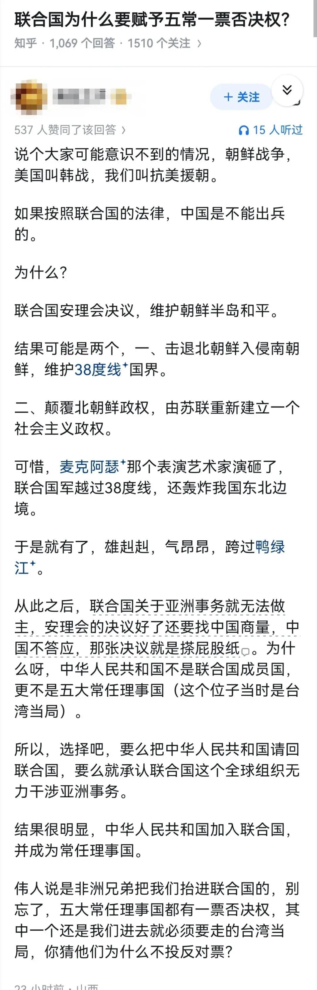 联合国五常拥有一票否决权的权利,不是联合国给的,是自己打出来的。 朝鲜战争是这样,越南战争也是这样。有联合国决议又怎么样?只要中国不同意,那联合国的决议就是一张废纸。 不仅仅是中国这样做了,美国和俄罗斯也这样做了。 试想一下,假如俄罗斯不是联合国五常之一,他打了乌克兰,结果联合国决议谴责俄罗斯,但是俄罗斯又不听,那该怎么办? 是不是只有联合国丢脸了?