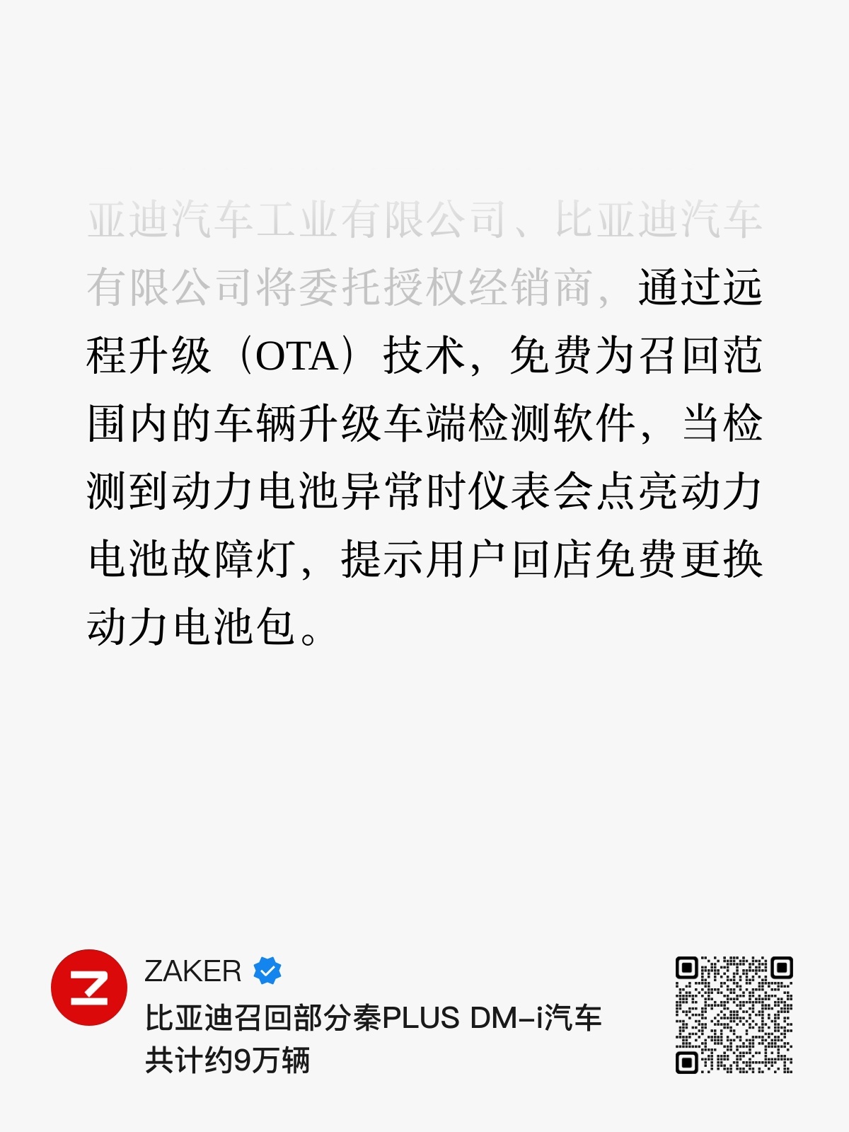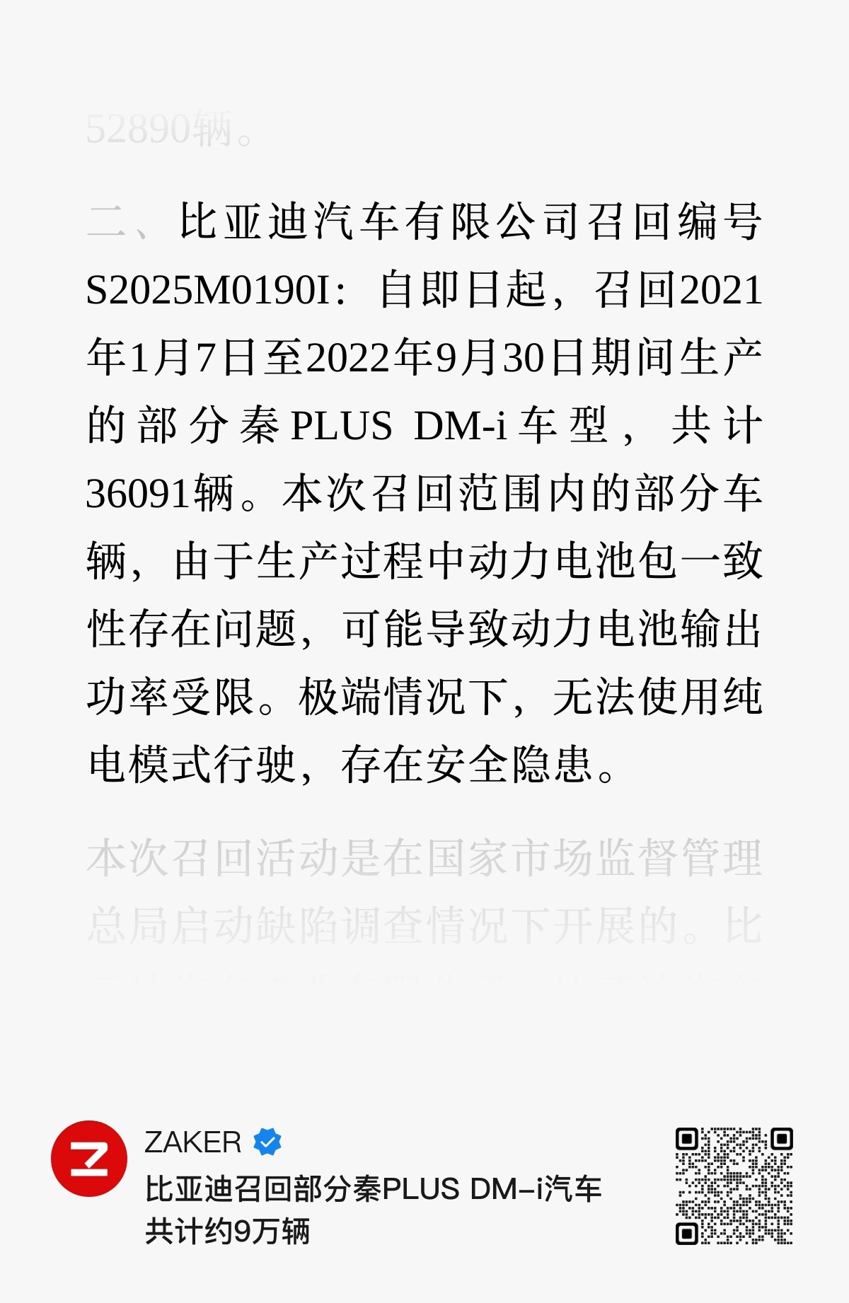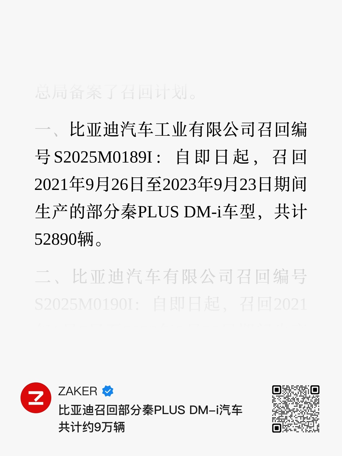 比亚迪召回大概9w辆秦PLUS DM-i,理由是存在电池包一致性出现问题。可以通过远程OTA的形式进行检测,如果出问题会【更换电池包】,代价不小。电池包电芯一致性问题由于生产过程中未能保证所有电芯参数的高度匹配,会导致输出功率受限、失速,甚至引发电池过热、短路。召回编号是S2025M0189I、S2025M0190I,尾号是“I”,说明是被动召回。
