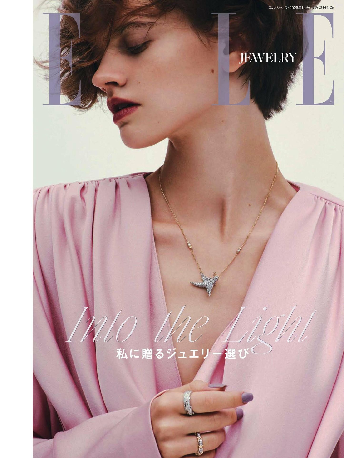日版ELLE 珠宝特刊,难得的构图方式,很少看到杂志封面将人物的脸部拉到版头位置。视觉效果完全不一样,目光立刻聚焦在修长的脖子、完美的锁骨和展示的珠宝上,且整体色系以粉紫为主基调,呈现温柔又克制的美。时尚灵感解读时尚头排客