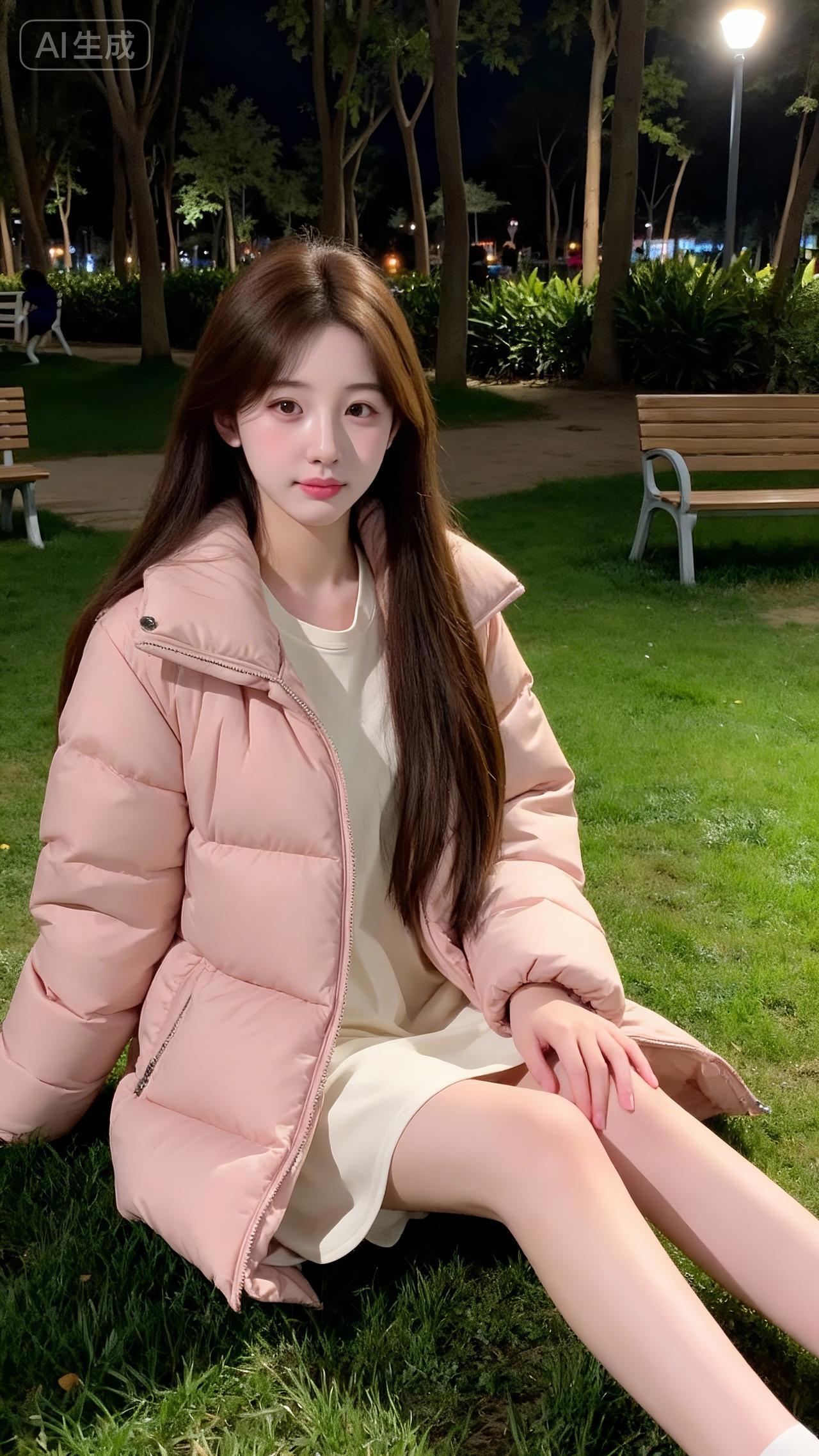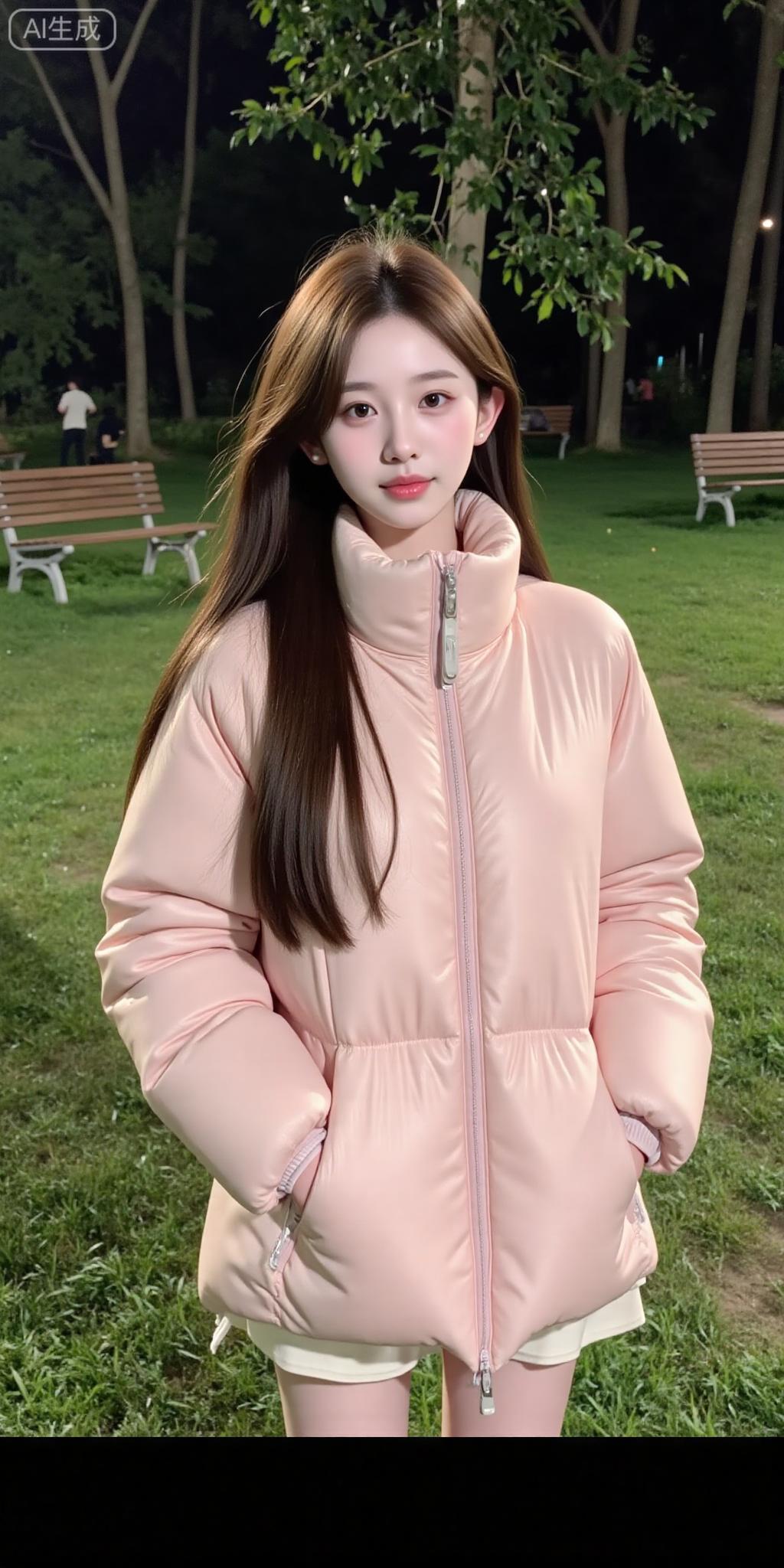 夜园甜妹,粉羽绒服配奶白裙,温柔纯欲氛围感拉满温柔羽绒服穿搭 少女感羽绒服 淡粉色羽绒服