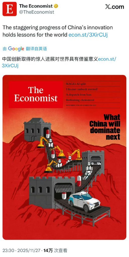 《经济学人》:东大创新取得的惊人进展对世界具有借鉴意义创新药,人形机器人,新能源汽车,是今年名声最响的行业,汽车排在最前面,应该意思是已经成型了。看了原文,基本算小正面肯定了东大的发展有企业创造力+ZF的灵活应变,顺带反思美国和欧洲的问题。经济学人不给钱就较为正常,给钱就黑东大 PS:封面这个阴森画风太典了 烽火问鼎计划
