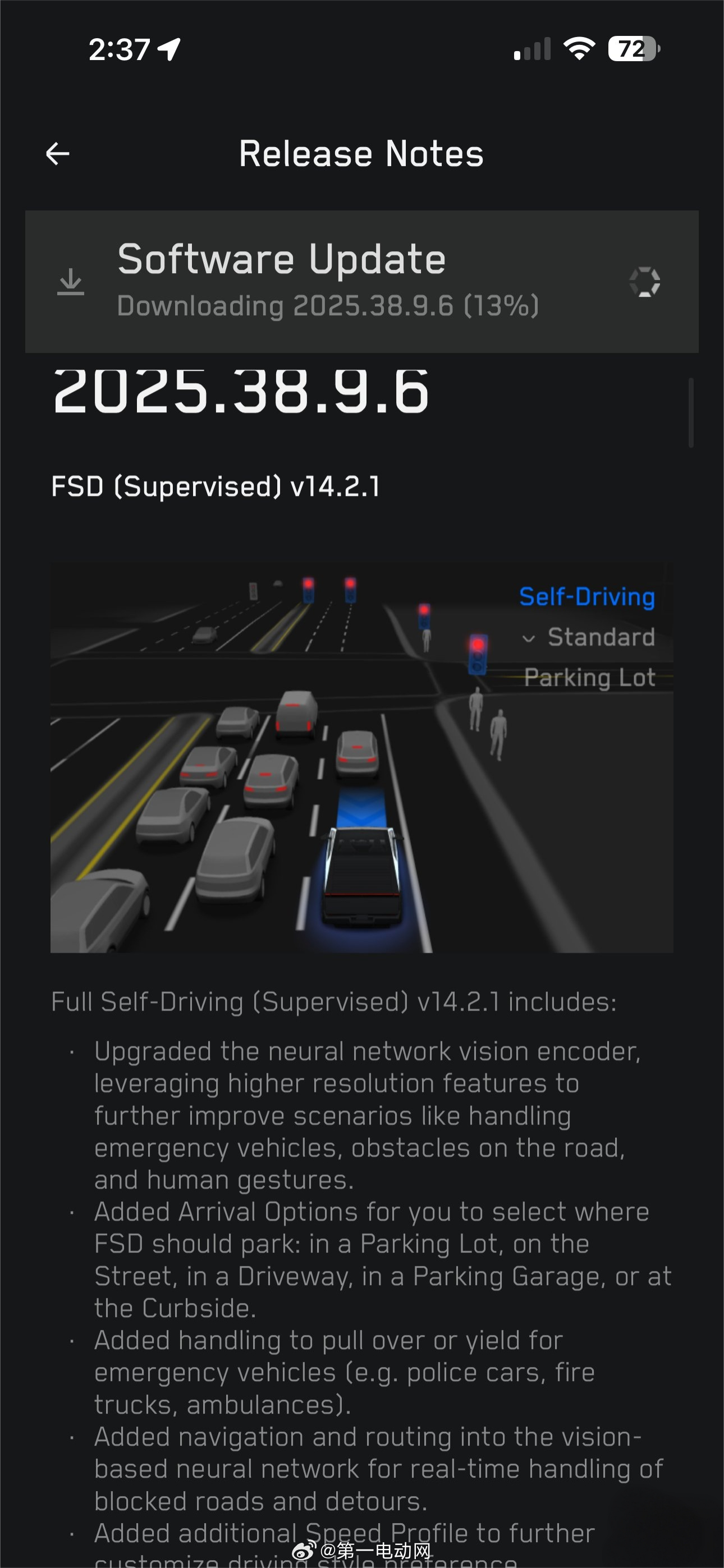 仅间隔约一周,特斯拉FSD有退出了一个小版本V14.2.1的更新主要针对已搭载AI4芯片的特斯拉车主以及Cybertruck车主可能会提升摄像头可见性,从而增强注意力监测的灵敏度还是挺期待年底会不会有一个14.3的版本 特斯拉FSDv14自动驾驶