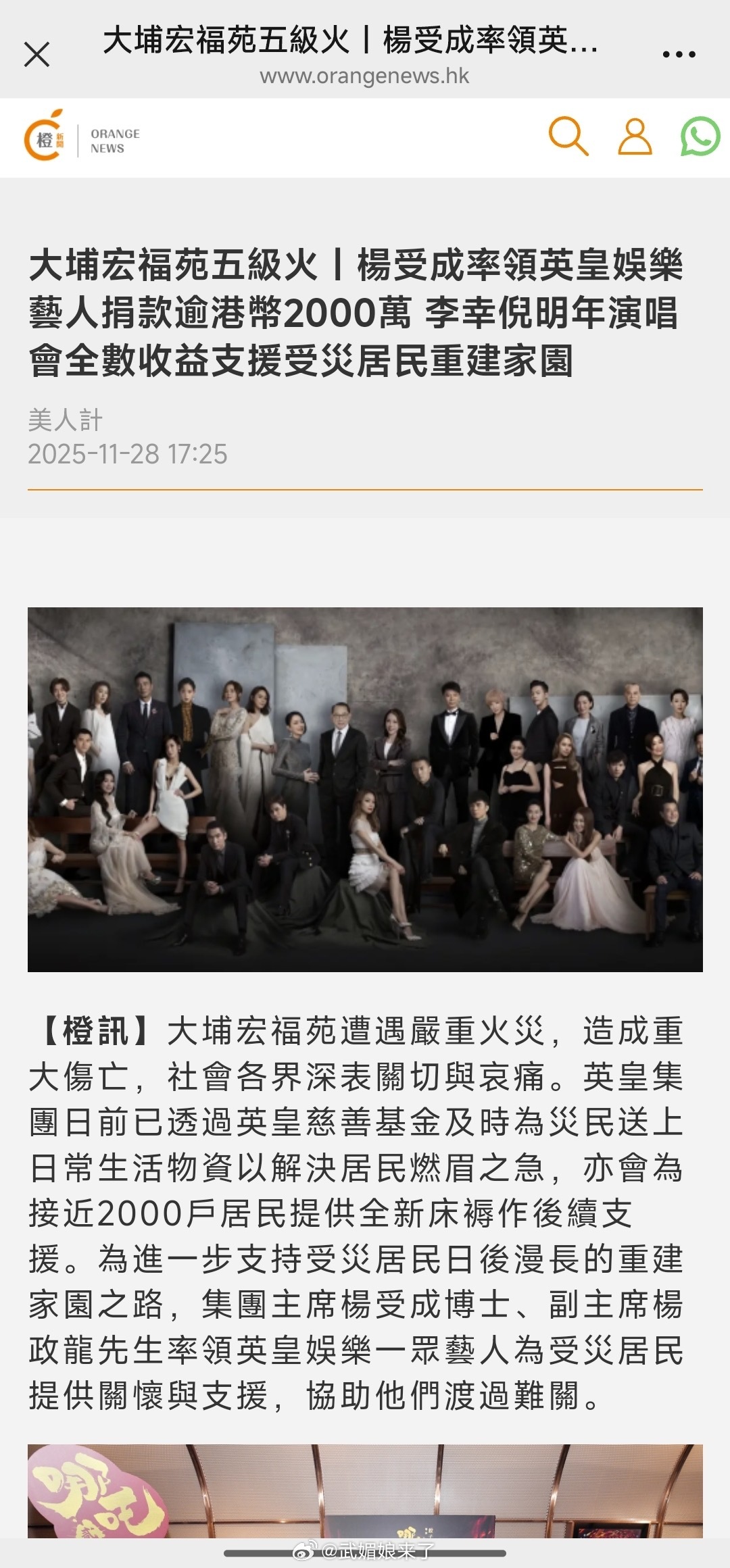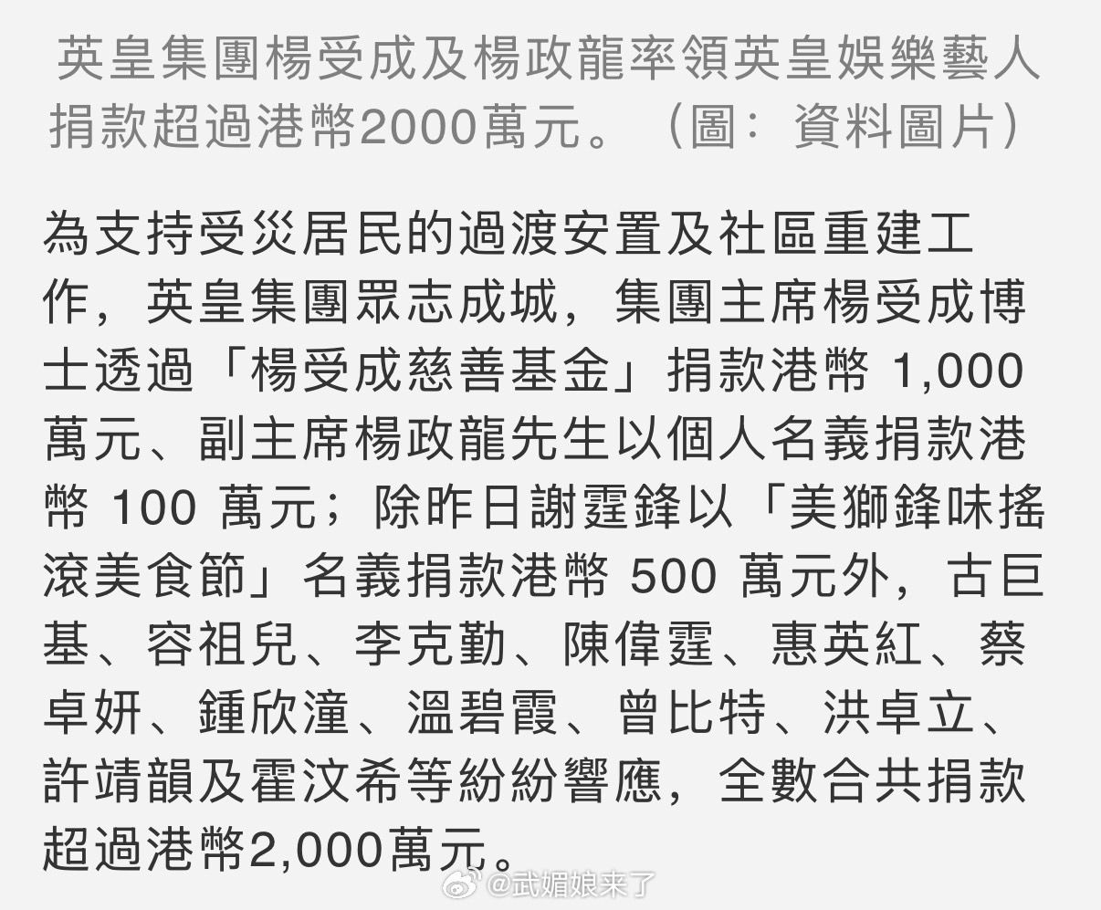 陈伟霆为香港火灾捐款100万陈伟霆和众英皇艺人为支持香港大火受灾居民的过渡安置及社区重建工作,共捐款超过港币2000万元! 陈伟霆捐款100万元
