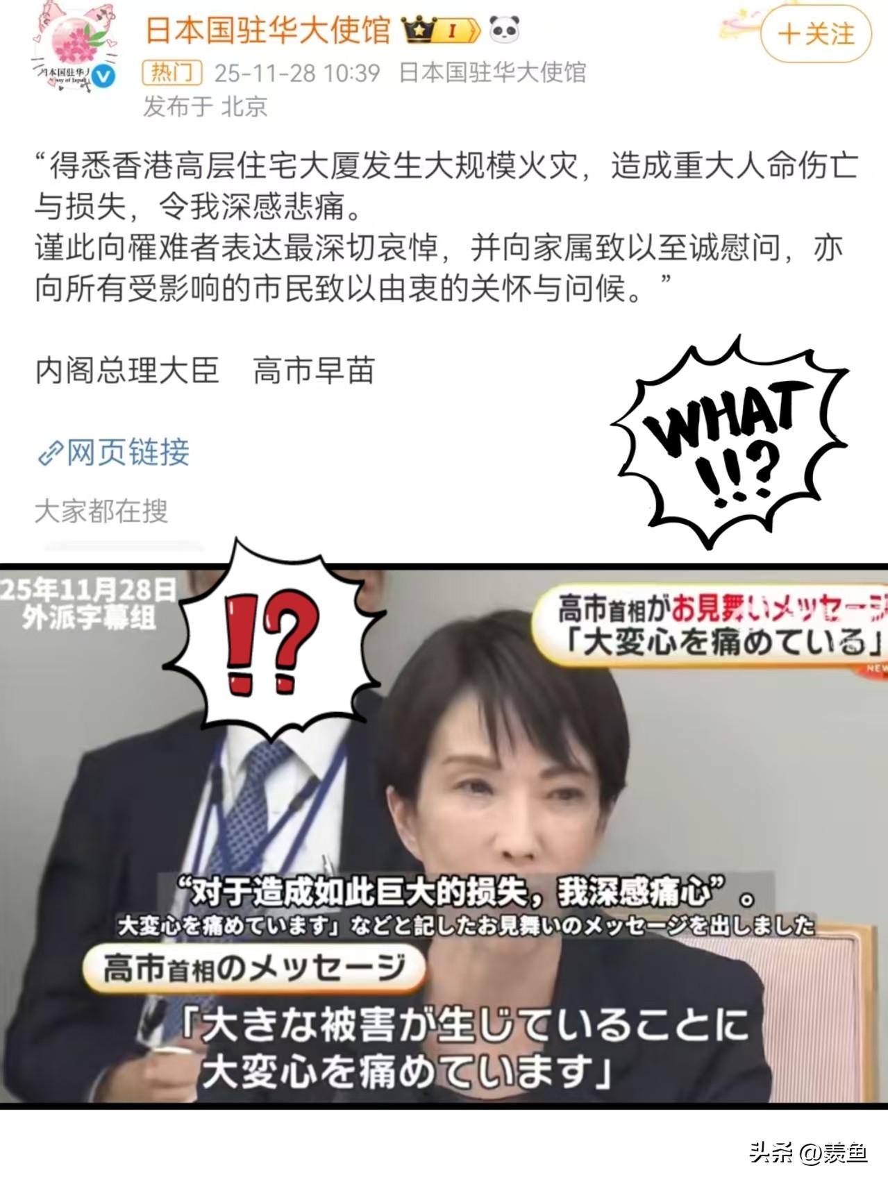 我看不懂这操作 高市早苗又有什么目的? 香港这事儿,她在谈话中表示:此次香港高层住宅发生大规模火灾,造成重大损失,我对此深感痛心。向遇难者表示哀悼,并谨向其家属致以诚挚的慰问。同时,向所有受灾者致以衷心的慰问。 此前,高市早苗曾因在7日发表了暗示“台湾有事”时日本将介入的言论,与将台湾问题视为“核心利益中的核心”的中国方面产生了摩擦。香港特区行政长官李家超也曾在24日表示“对与日本交流的实效性产生了疑问”,这被认为是在呼应中国内地“限日令”的基调。 高市早苗这番发言,是不是拉人心,转移注意力浑水摸鱼是这样,还是挽回形象呢?