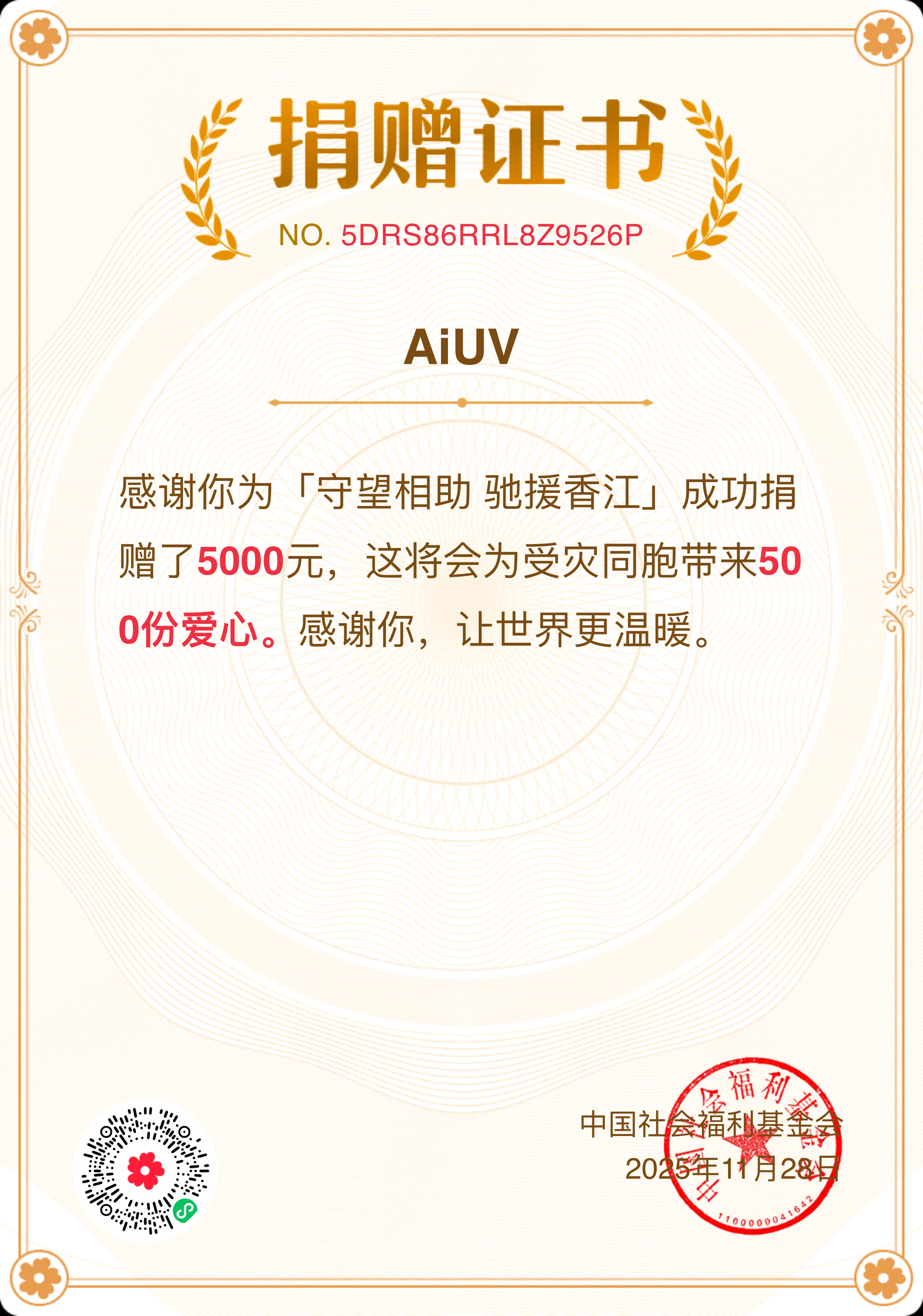 隔山海,亦同行。在此次香港受灾事件中,我们向受影响的同胞捐赠 5000 元,希望以这份微薄的支援,为大家的重建之路增添一份力量。愿所有受灾家庭早日恢复生活秩序,重建温暖、安全的新家园。
