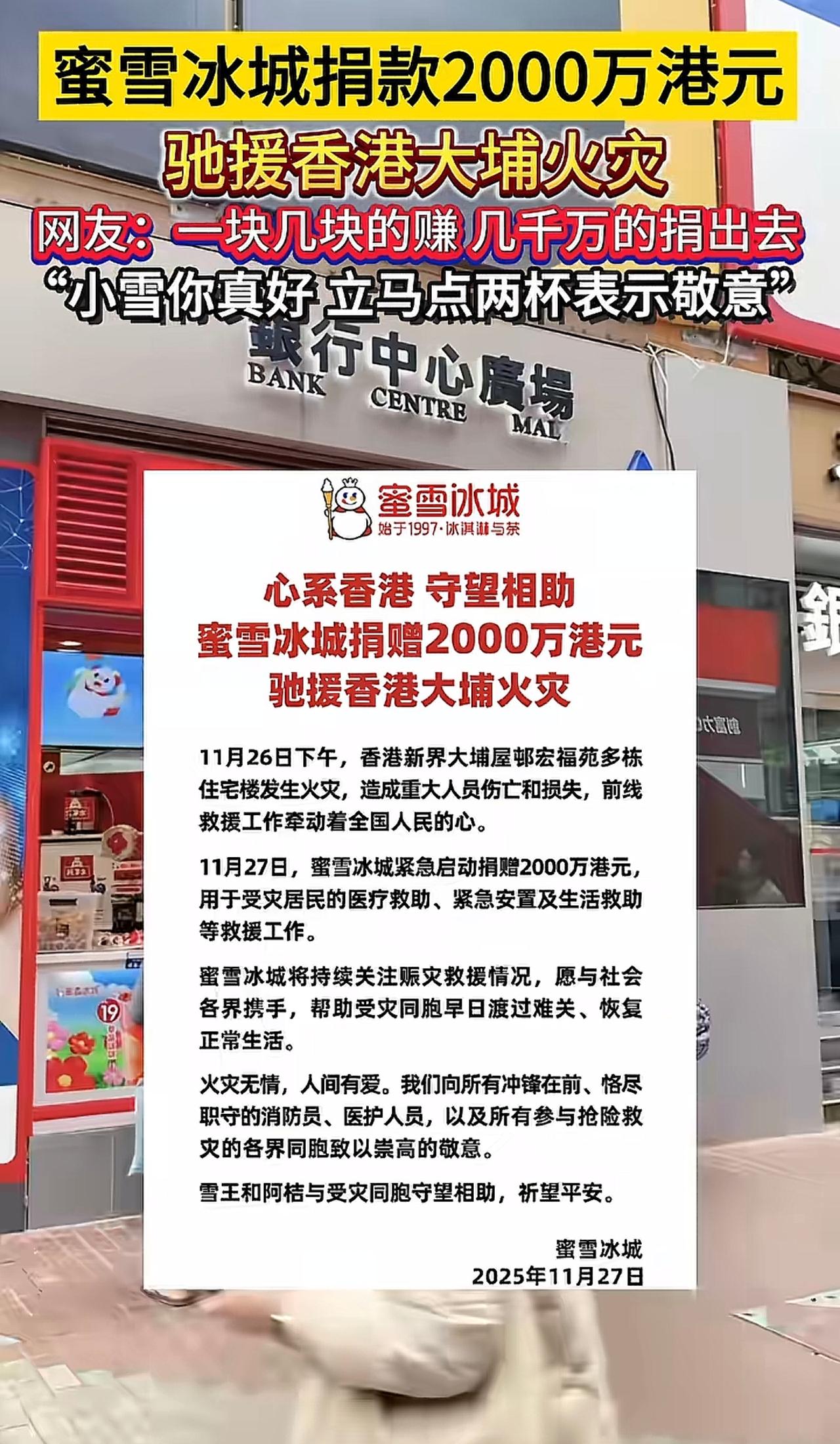 蜜雪冰城竟然捐了2000万港元,好样的! 真是没想到,香港新界这次火灾,造成人员、财产巨大损失,然而也看到了温暖的一面,捐款的竟然还有一家饮品店。 虽然全国连锁店很多,一杯饮品利润很大,但是能关键时候拿出2000万港元,能看出这位老板的格局真的很大。 用蜜雪冰城的一句话“希望共渡难关”。蜜雪冰城 蜜雪冰城港股
