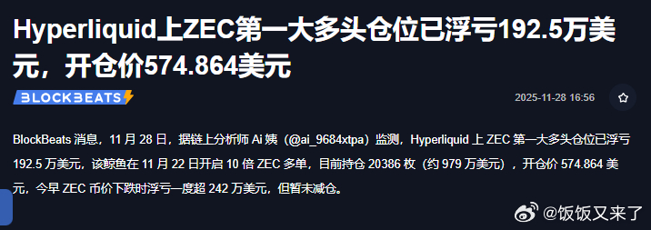 链上分析显示,Hyperliquid上ZEC最大多头仓位目前浮亏192.