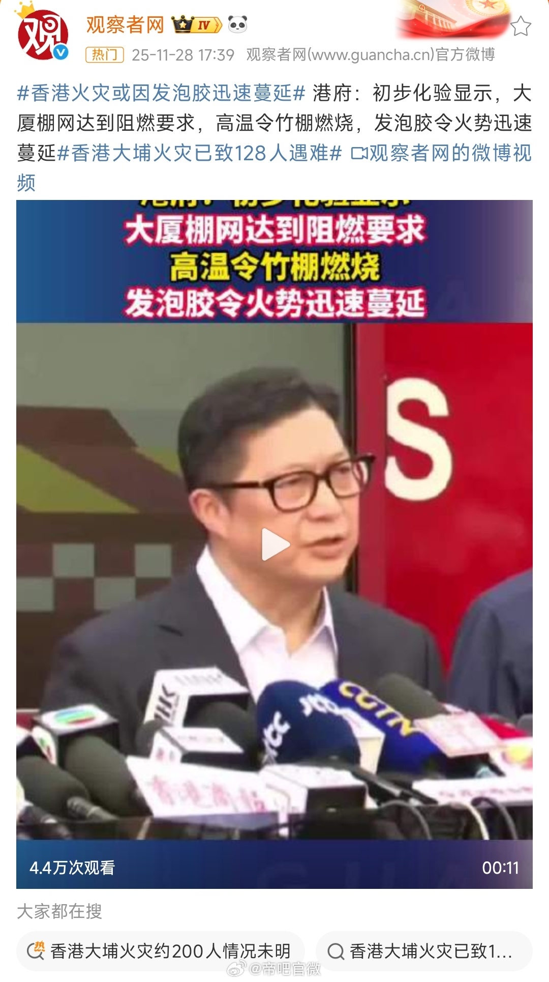 大厦棚网达到阻燃要求,高温令竹棚燃烧。然而外面都在抹黑棚网,狂吹竹棚,已经把竹棚吹成刀枪不入了,仿佛以后载人航天都可以用竹棚了香港大埔火灾已致128人遇难