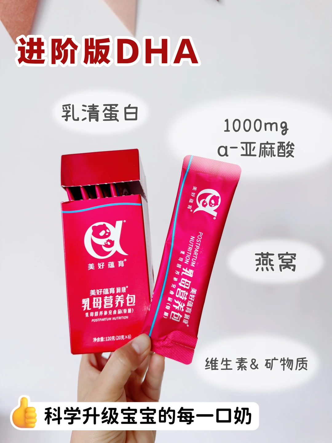 这个美好蕴育乳母营养包每包含1000mg的α-亚麻酸,这个可是进阶版的DHA呢!来自陆生植物高纯度萃取,更安全;能在体内代谢成DHA、EPA,代谢DHA的速率是大脑吸收DHA速度的3倍,是进阶版DHA,对宝宝和妈妈都很友好!