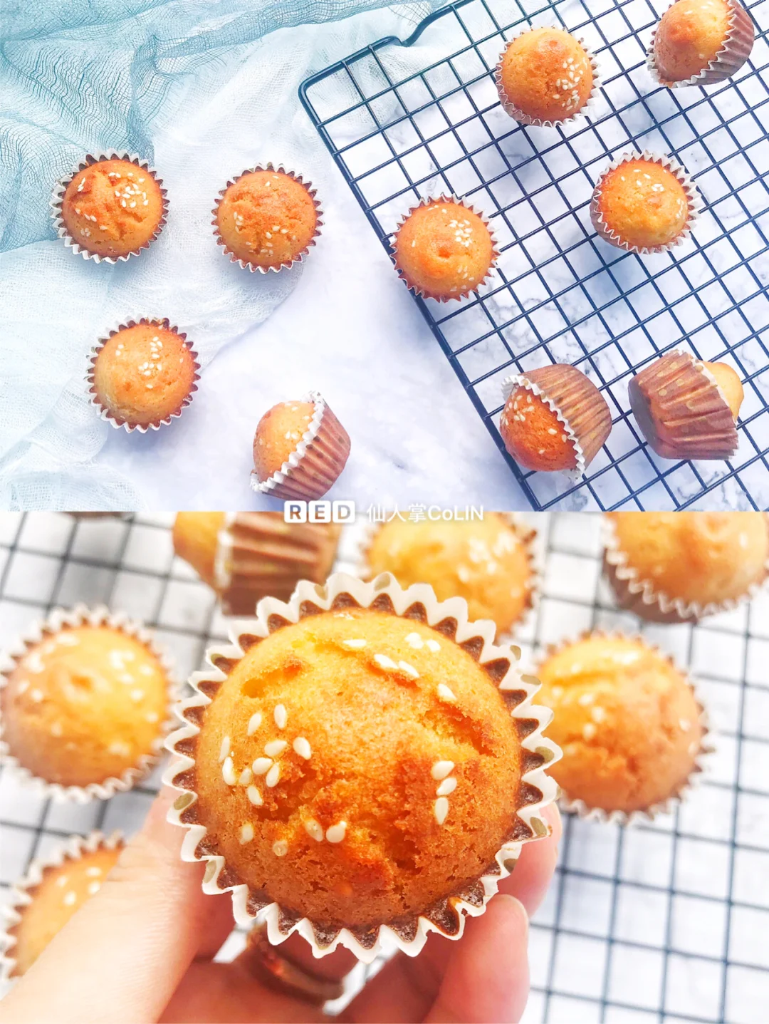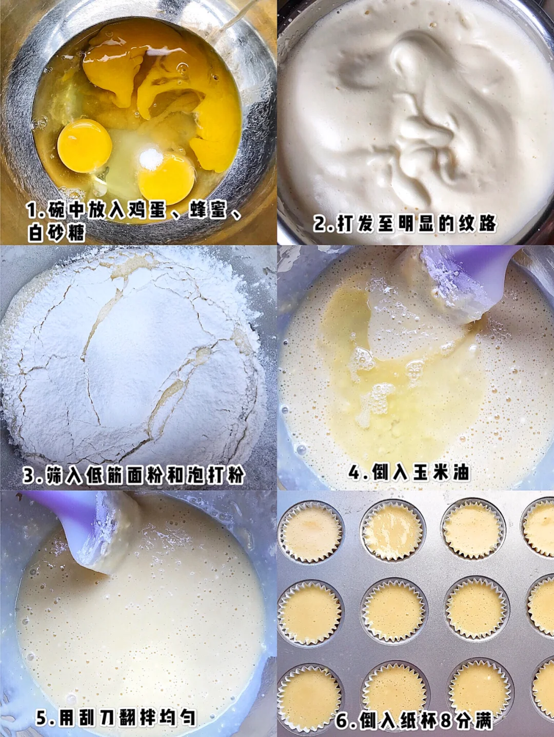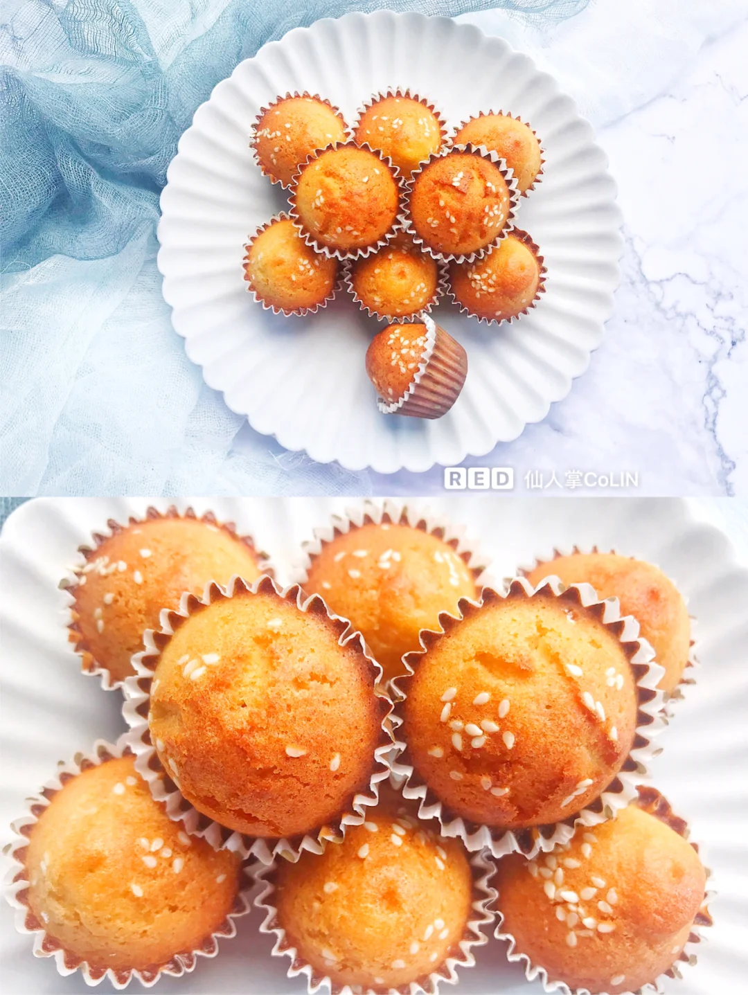 小时候的快乐特别简单, 只要妈妈去市场买了我爱吃的蛋糕🥧 我就能开心一整天 那个时候最火🔥的就是论斤称的蜂🍯蜜蛋糕 现在市面上已经很少了,但是我又超想吃 所以就自己做喽。 自己动手以后发现原来这么简单❗️ · 📝食材准备: 蜂蜜60g 细砂糖30g 鸡蛋3个 低筋面粉130g 泡打粉1g 玉米油45g 白芝麻适量 · 📝步骤: 1️⃣把鸡蛋打入无水无油的碗中,依次放入蜂蜜和细砂糖,用电动打蛋器高速打发至提前打蛋头,面糊画8字不会消失。(⚠️全程大概5分钟) 2️⃣筛入低筋面粉和泡打粉,用刮刀翻拌均匀,没有干粉的状态。 3️⃣倒入玉米油继续用刮刀翻拌均匀到完全融合,没有水油分离的样子。 4️⃣把面糊倒入纸杯里,大概8分满就够了,表面撒上白芝麻。放入烤箱170度20分钟。 · 🧚🏻‍♀️这个分量我是做了2️⃣份20连排的迷你小蛋糕,一口一个,蜂蜜味很浓,还混合着芝麻的香味,如果觉得鸡蛋味比较浓,受不了蛋腥,可以加几滴香草精,会很香哦~