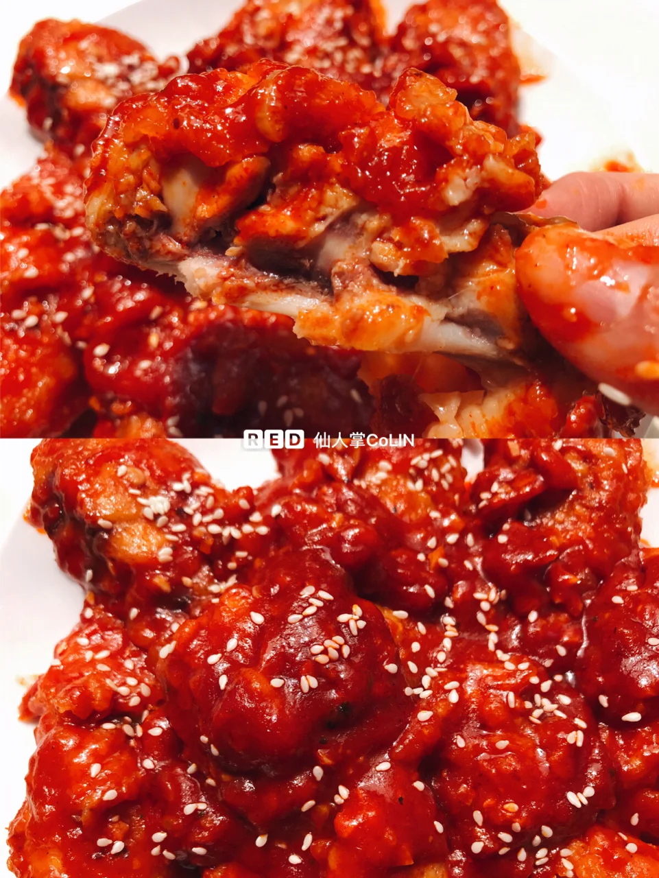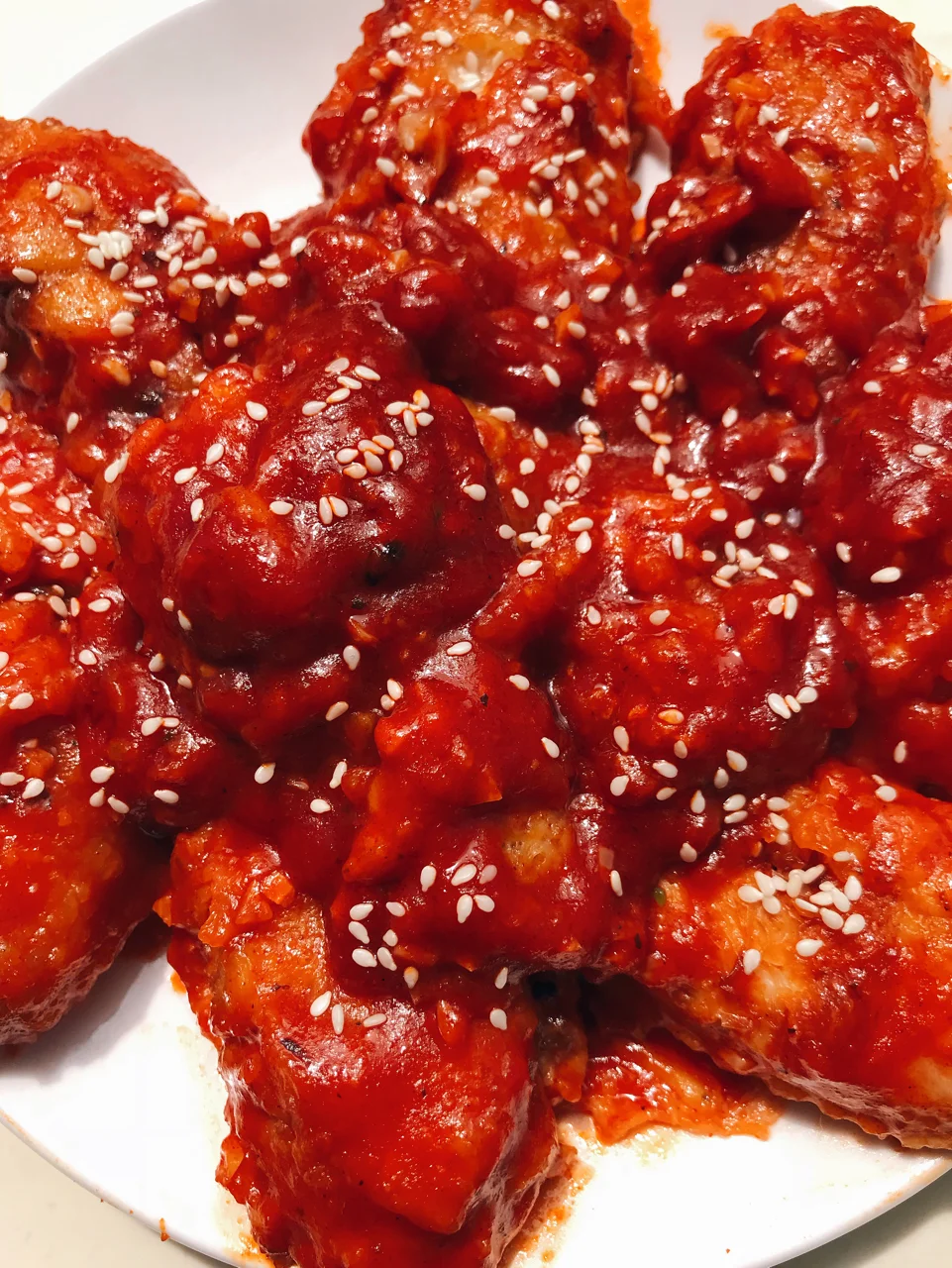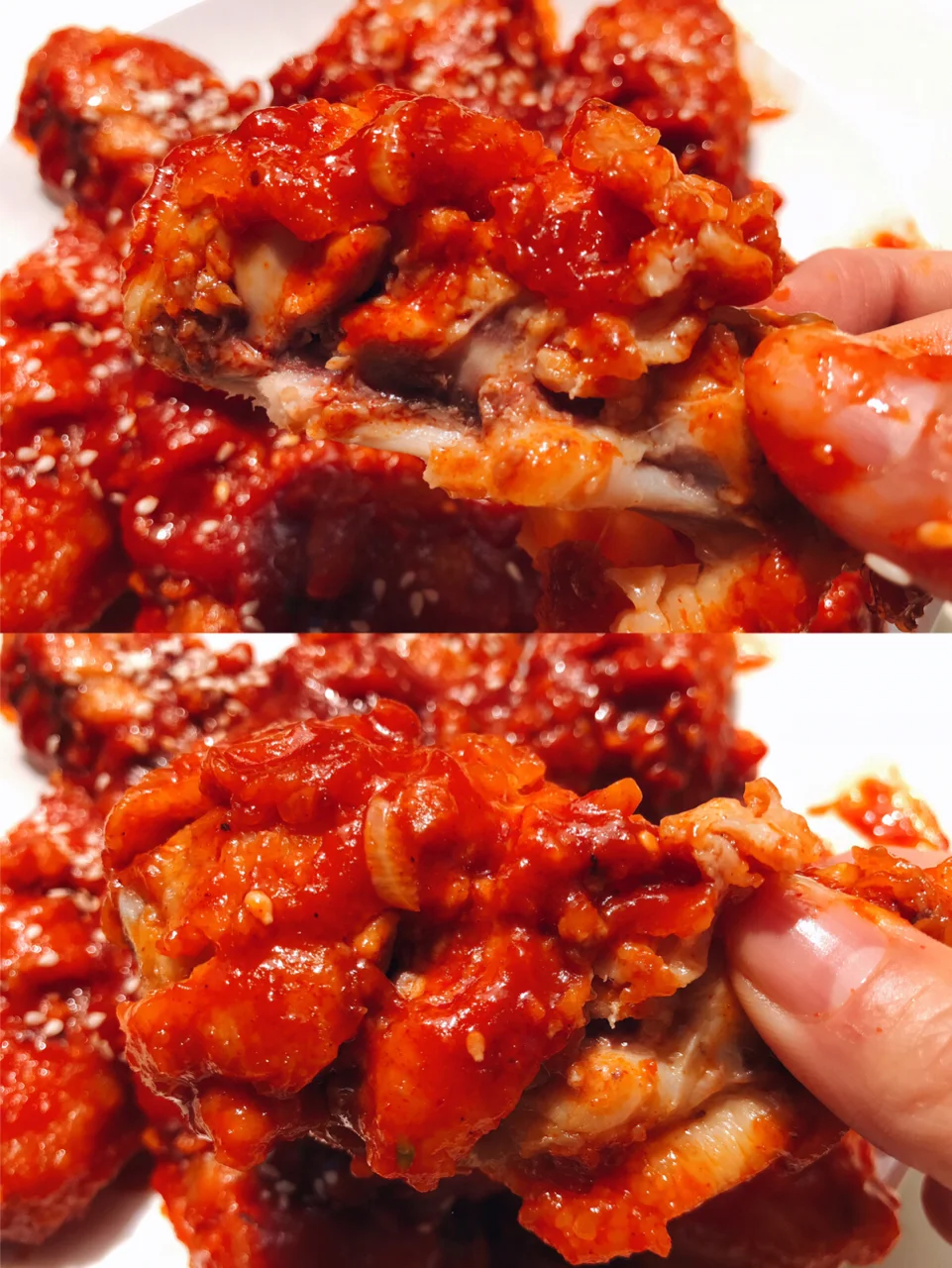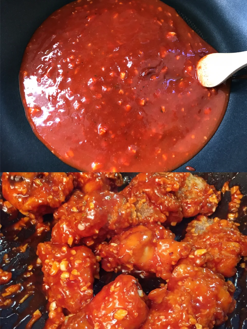5️⃣另取一口平底锅,倒入刚才调好的酱料进行翻炒,表面冒出小泡泡以后倒入刚才炸好的鸡翅,反复翻炒。等酱料均匀的裹上每一个鸡翅以后就可以撒上白芝麻出锅啦。
