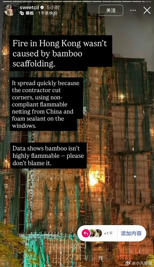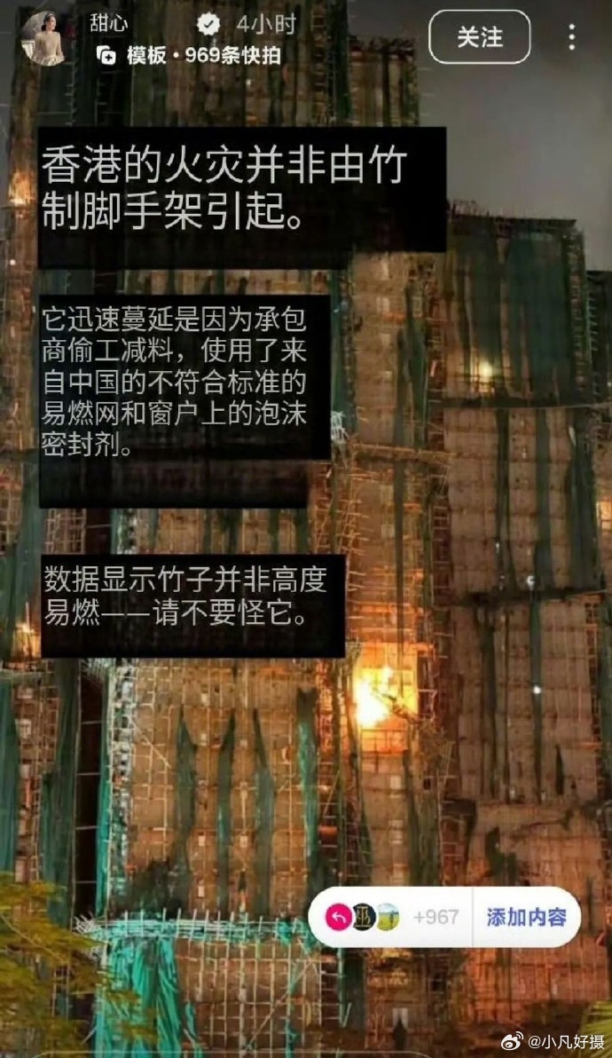 甄子丹老婆ins发文 称:“香港火灾迅速蔓延是因承包商使用来自中国的不符合标准的易燃网和泡沫密封剂”,同时强调“竹子并非高度易燃,请不要怪它”。其后,汪诗诗又在微博道歉。香港大埔火灾已致128人遇难黄媒不会说的真相