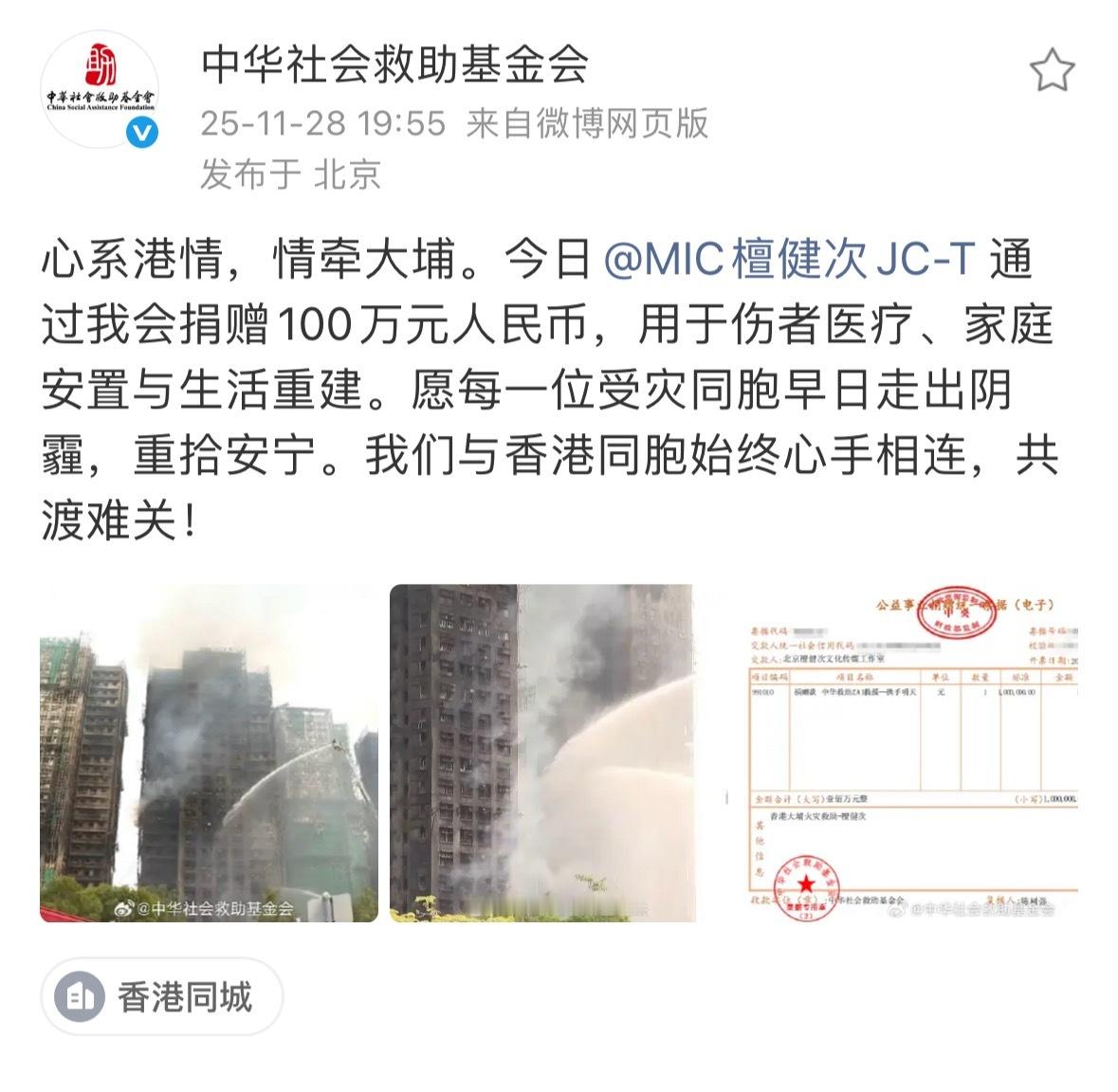 檀健次为香港捐赠100万元檀健次通过中华社会救助基金会捐赠100万人民币,用于伤者医疗,家庭安置与生活重建。愿受灾同胞早日走出阴霾重拾安宁檀健次捐赠100万元
