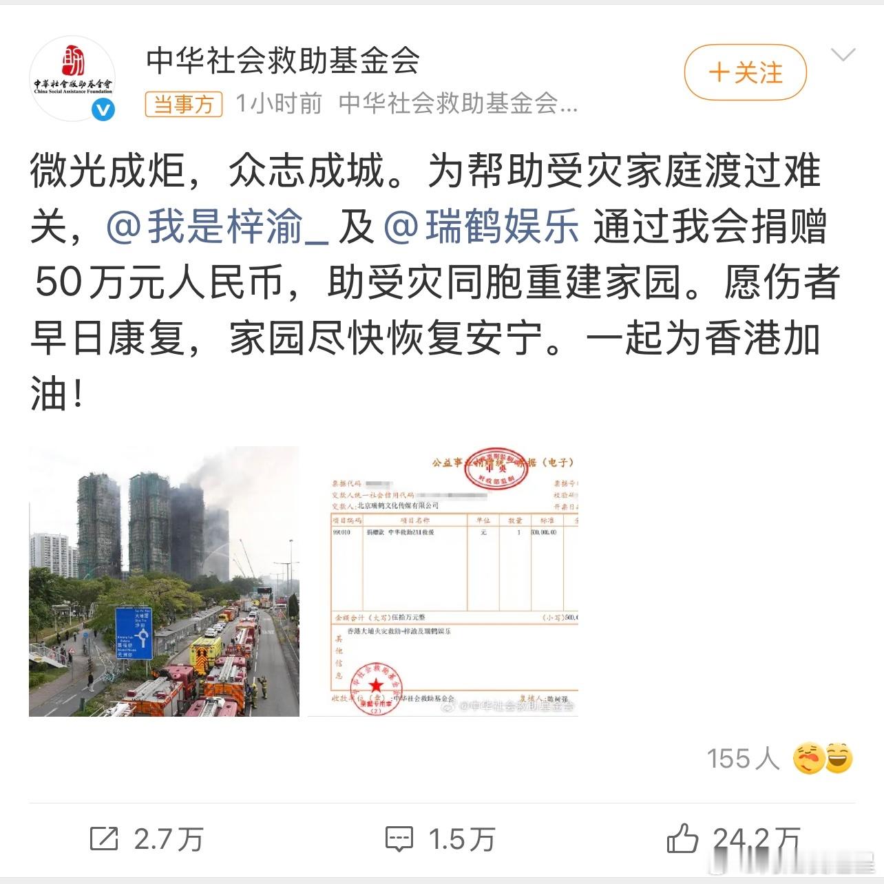 梓渝淋过雨,也想为同胞撑一把伞,还没挣多少,又捐了,大气梓渝向香港捐款50万元