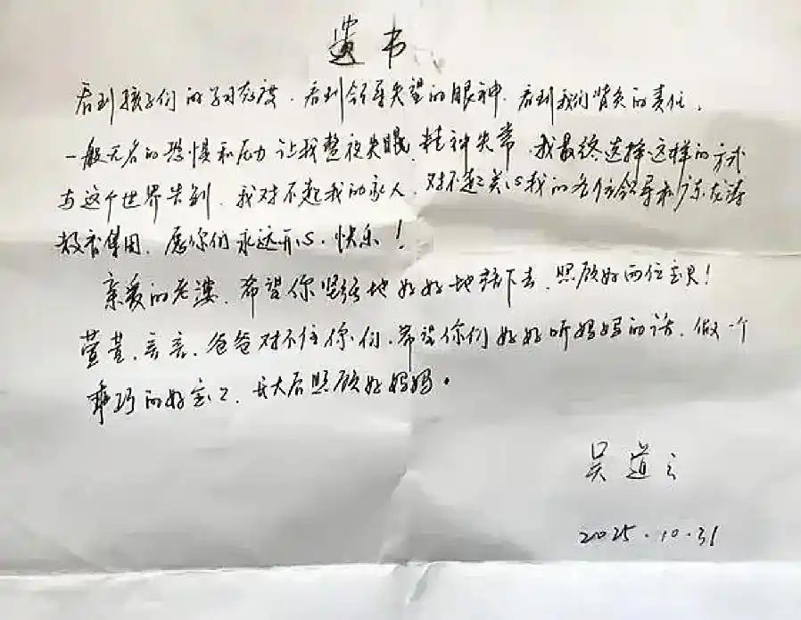 一位42岁老师的遗书。 即使是遗书,依然如同在做报告,先表达自己轻生的歉意,又感谢各位领导,希望他们永远开心快乐。 他吴道云,自杀半月前还在学校做过报告,看起来疲惫,教书16年,担任教务主任,还教着语文和历史,这是妥妥的骨干教师呀。 这些压力是积攒下来的,可能某件事成了导火索。 给老师的压力之大,竟压垮了这样一位有担当的中年男子。 生活不易,请多关爱身边人,明天会更好!