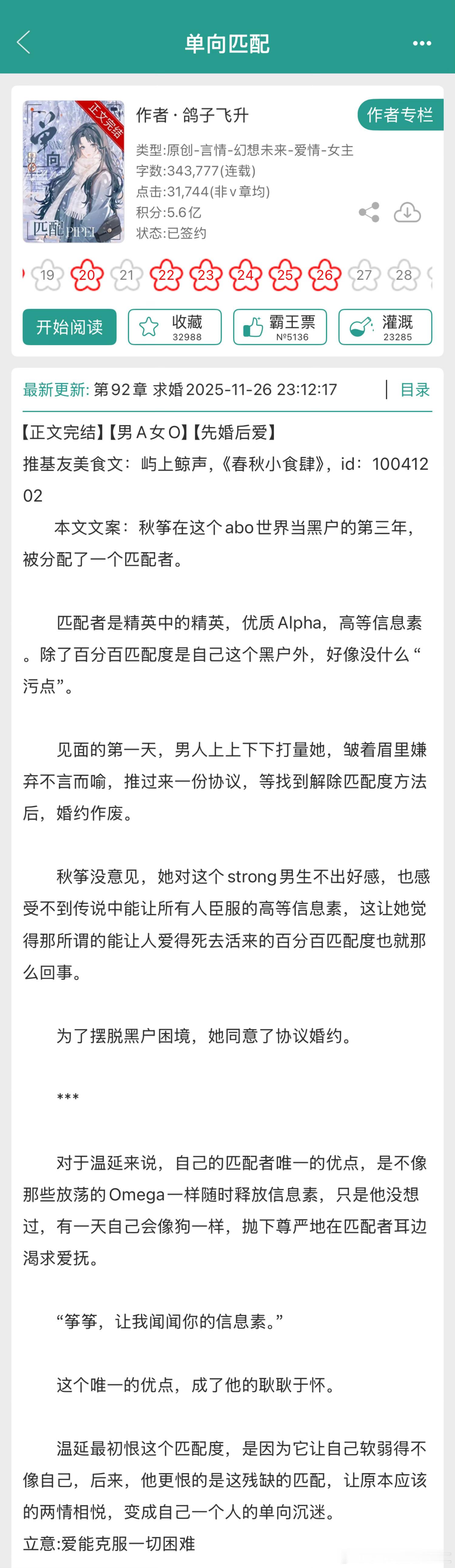 推文 《单向匹配》by鸽子飞升推荐指数:⭐⭐⭐关键词:ABO/男A女O/穿越/先婚后爱 小甜文 女主身穿到ABO世界,因为是黑户,受了一番磨难,所以当男主找上门来提出协议结婚,她同意了。 男主对女主越来越在意,他觉得是百分百的匹配度在作祟,一度想抵抗女主的吸引力,还写了个[抗O手册]笑死我了。结果百分百匹配是单向的,女主对他的匹配度是0 然后就开始了装货的追妻路。 中间出现一个男配,他和女主互相的匹配度达到了百分之八十。男主第一反应就是阻挠他们认识。可是缘分很奇妙,女主和男配意外邂逅,并且相谈甚欢。百分之八十匹配度有点东西男主嫉妒死了。