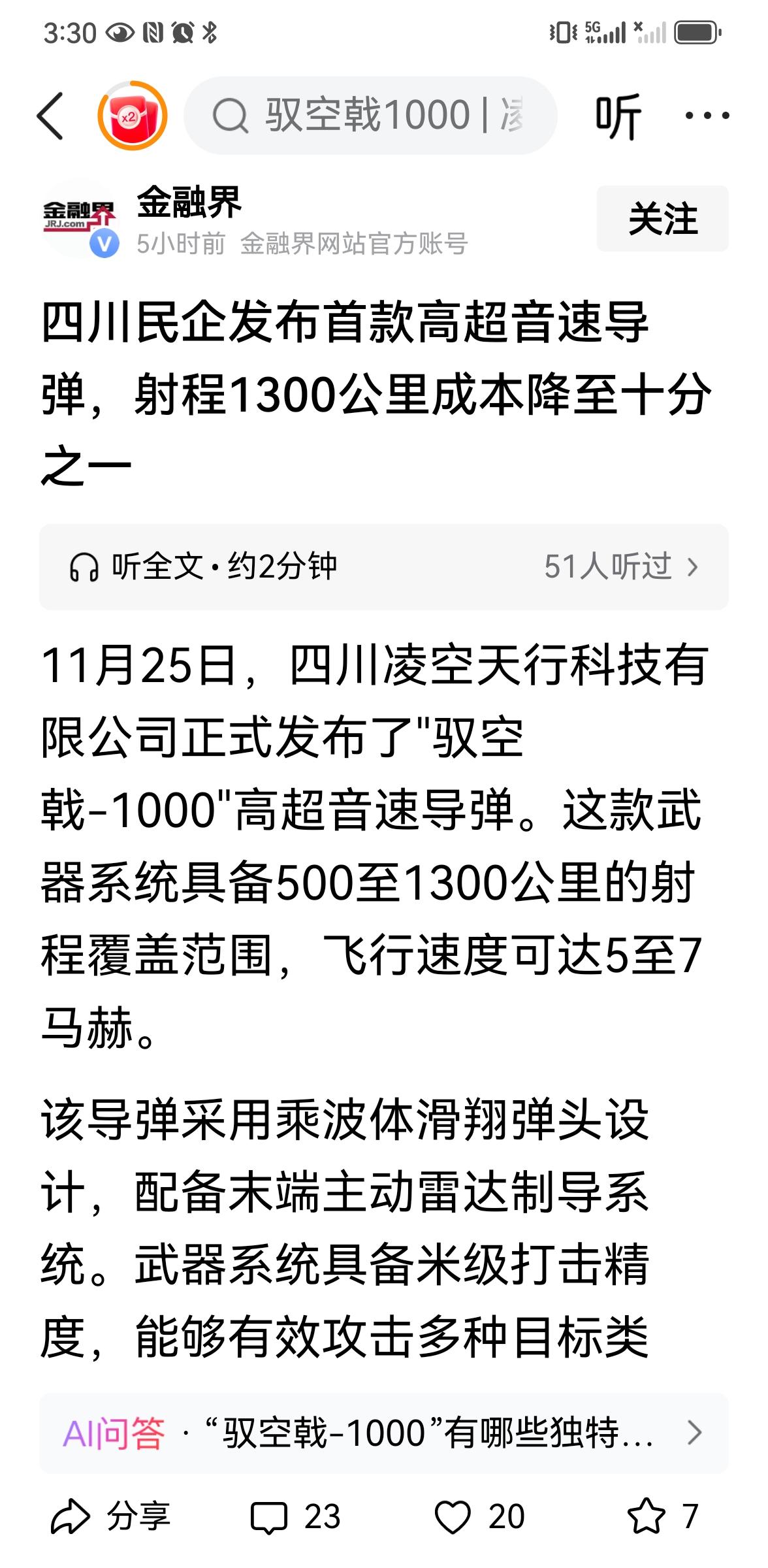 民营企业凌空天行干出了超高音速导弹且成本降至1/10,如此逆天吗? 乍一看我还以为“凌波微步”绝世神功,难怪他们这样牛逼居然能研发生产超高速导弹。这方面连老美都干不利索,我们的民营企业居然干出来了,关键成本低且可大量量产。 据公开发布的资料显示该民营企业研发的“驭空戟-1000”高超声速导弹,核心参数包括:500—1300公里射程、5—7马赫飞行速度及360秒动力巡航时间。该导弹具备自动识别目标、躲避威胁等智能特性,可通过陆基发射车部署,专门针对海上移动平台和各类舰艇实施精准打击。 果然我们的工业生产能力不一般,工业配套的齐全,基础教育的持续发力,整个社会孕育着越来越强大的创新能力和解决现实问题的能力。 我想或许我们的国家还会创造出更多的奇迹,有更多的事可以振奋我们的人心,震惊全世界。如此我们所倡导的“和平崛起”才会更加有希望——不战而屈人之兵。 高超音速导弹