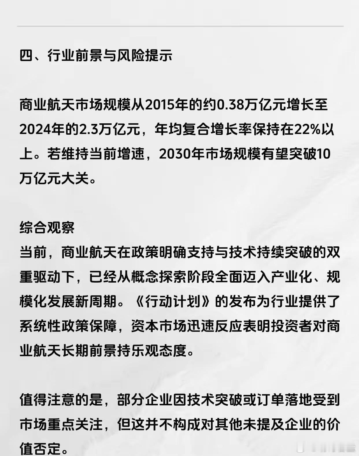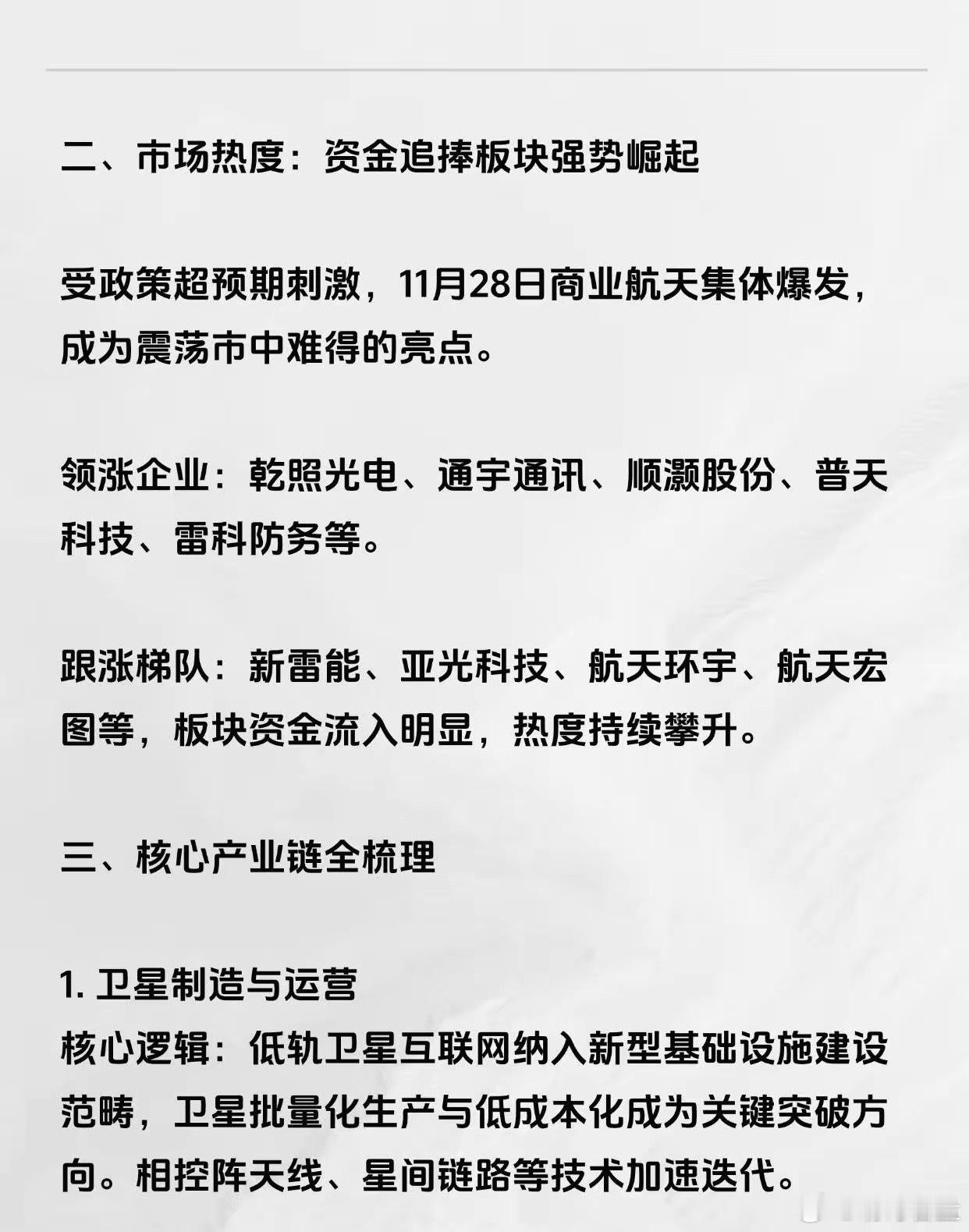 商业航天起飞啦,这风口可得抓紧!11月9日力箭一号遥九成功发射,这已是它第10次飞行,累计发射75颗卫星,入轨总质量超10吨。当下商业航天利好不断。政策上,壁垒降低,发射场资源开放,准入审批效率提50%;技术上,火箭回收复用等技术突破,成本大降;市场需求也井喷。2025年它有望成黄金赛道。A股里不少航天装备公司是核心受益股。像中国卫通,运营18颗商用卫星;中国卫星,专注宇航制造与应用;航天电子,搞航天电子测控等;中天火箭,是航天旗下探空火箭研制企业。赶紧布局,别错过这波红利!