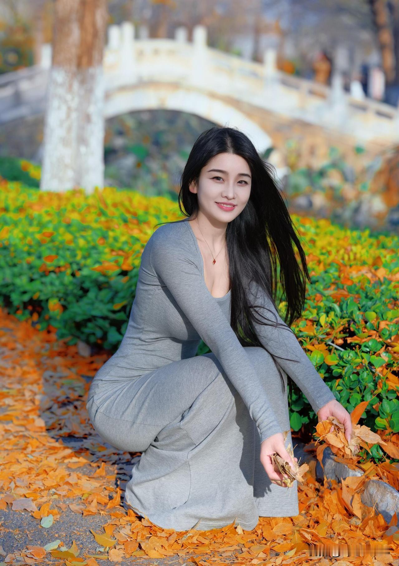 秋日暖阳下,微笑的少女与落叶共舞