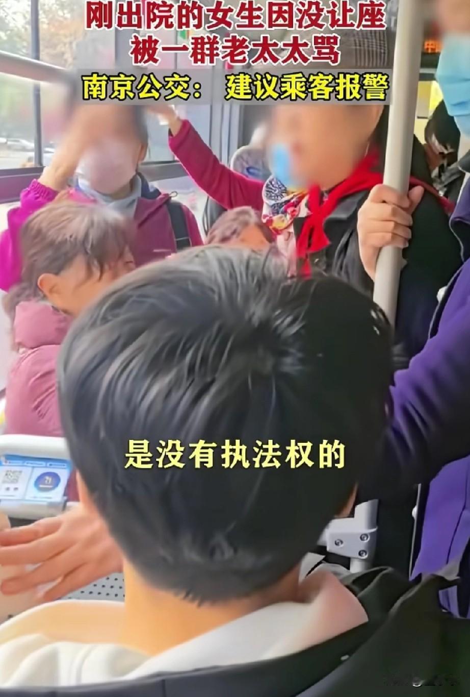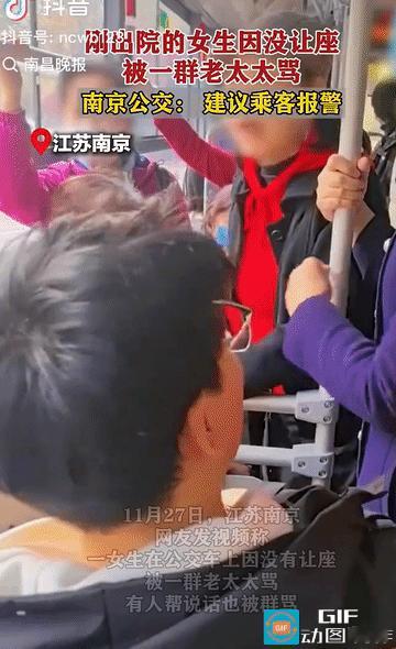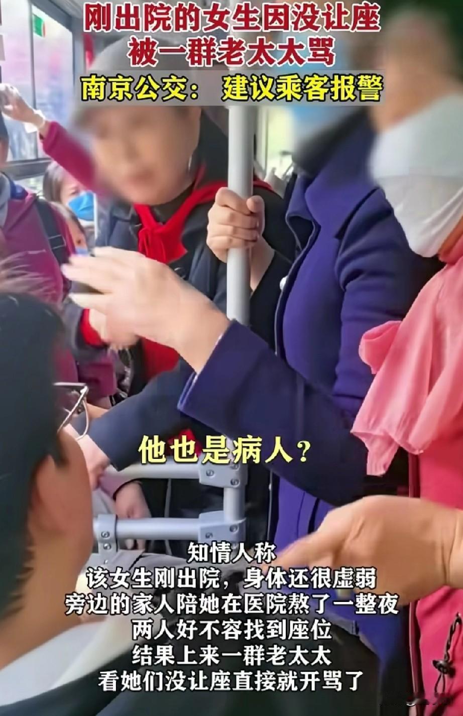 倚老卖老!近日江苏南京,某个公交车上一位刚出院的女生因为没有让座,被一群老人给围攻大骂了,有人帮忙也被牵连其中。 根据知情人告知,当天一对年轻人上来后,女生还是很虚弱的,旁边的家人因为陪护也是一脸的憔悴,好不容易找到了座位后。 一群大妈上来后没有座位,看到这两位年轻人没有让座,直接都上前围攻,尽管年轻人告知了自己是病人也无用,还是遭到了大妈的辱骂,就连车里其他的乘客帮忙劝说也被牵连其中。 从视频中可以看到,一群大妈在那里叽叽咕咕,想让座椅上的一对年轻人让座,人家都说了是病人刚出院,大妈不相信呀,还质问旁边的年轻男子,你也是病人。 这些大妈跳舞不知道多大的劲,超市抢鸡蛋多大的劲,就连年轻人都抢不赢他们的,凭什么让座。 中气十足,不需要让座。 让是情分,不让是本分。 老年人有老年证 免费坐车。 其它乘客 都是付过车费的,不让坐 理所当然。