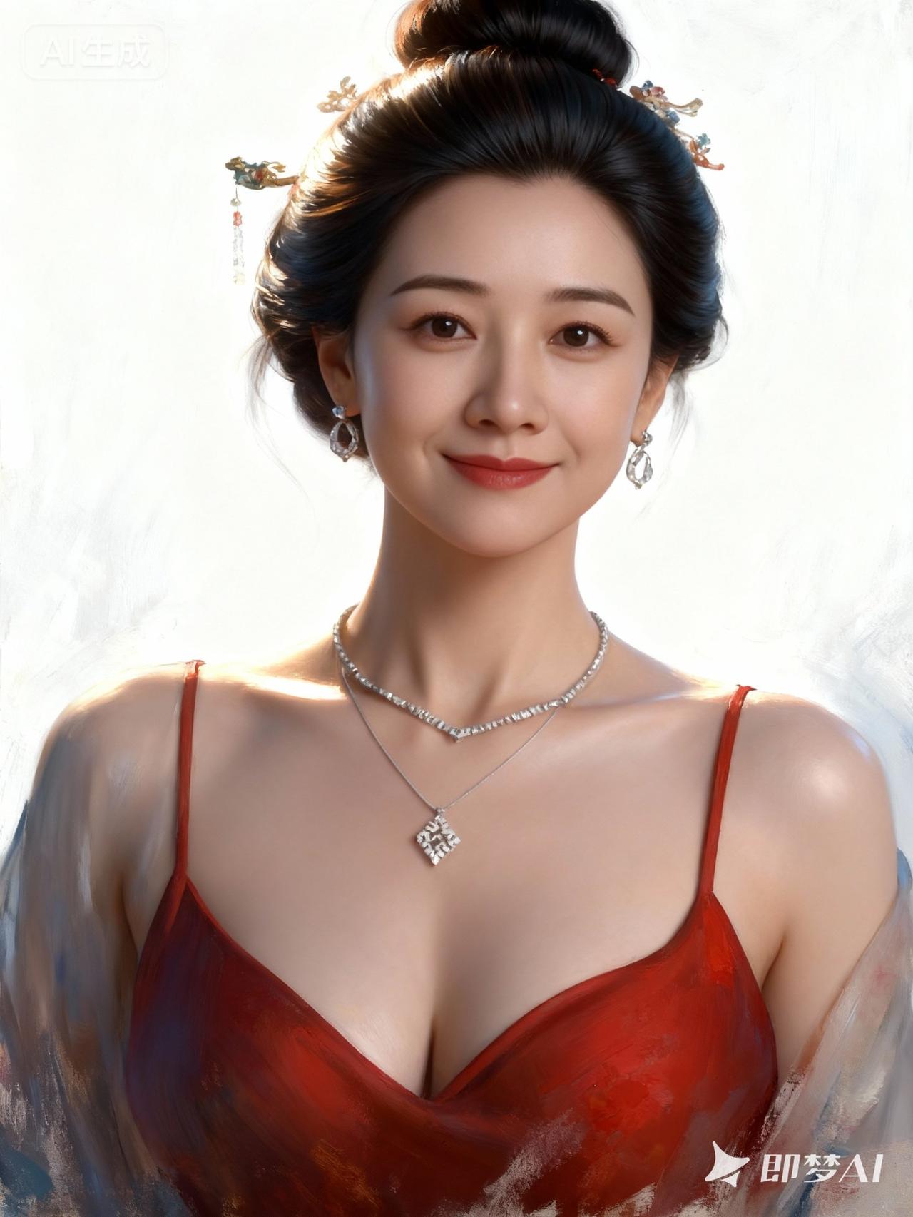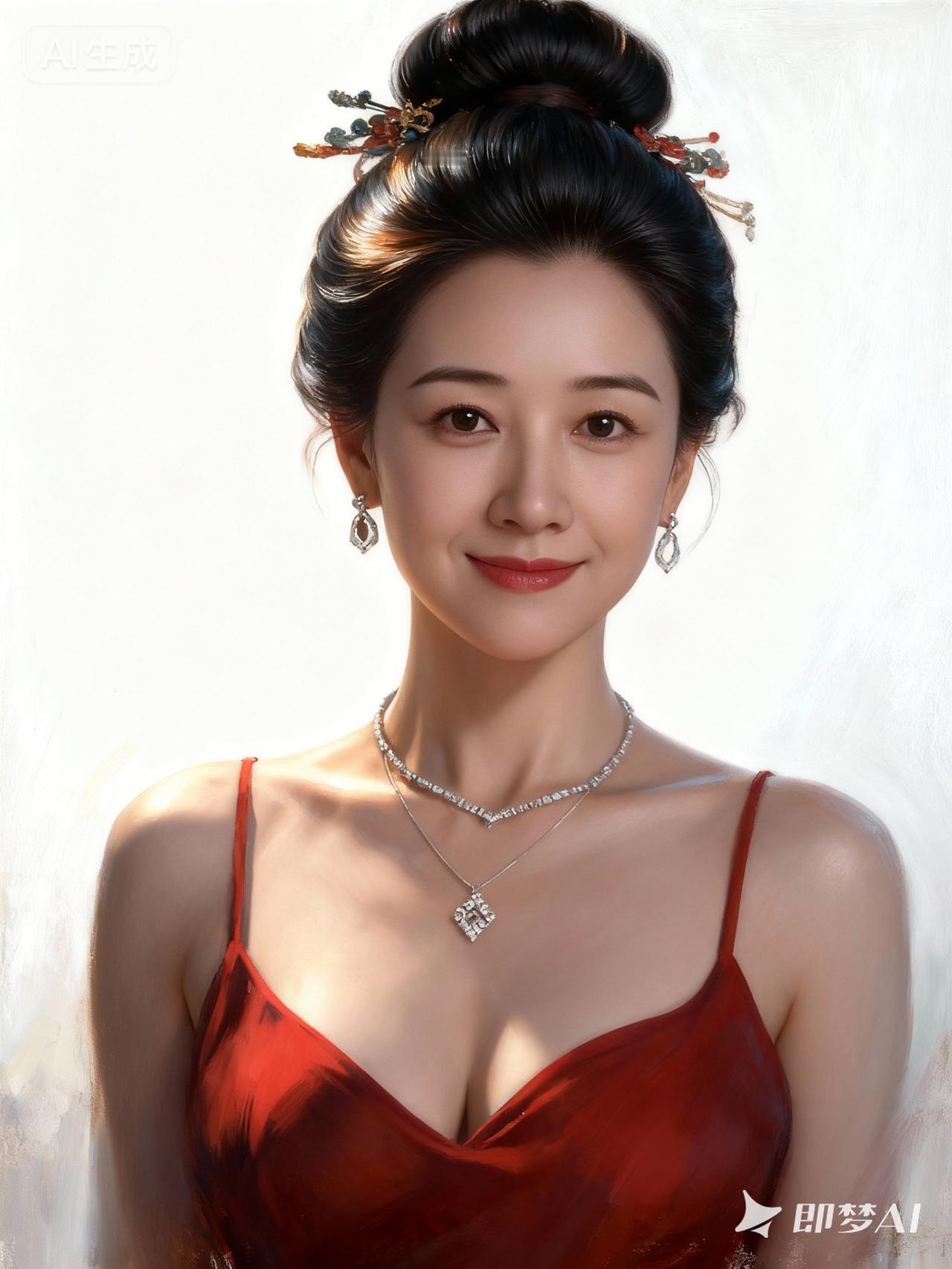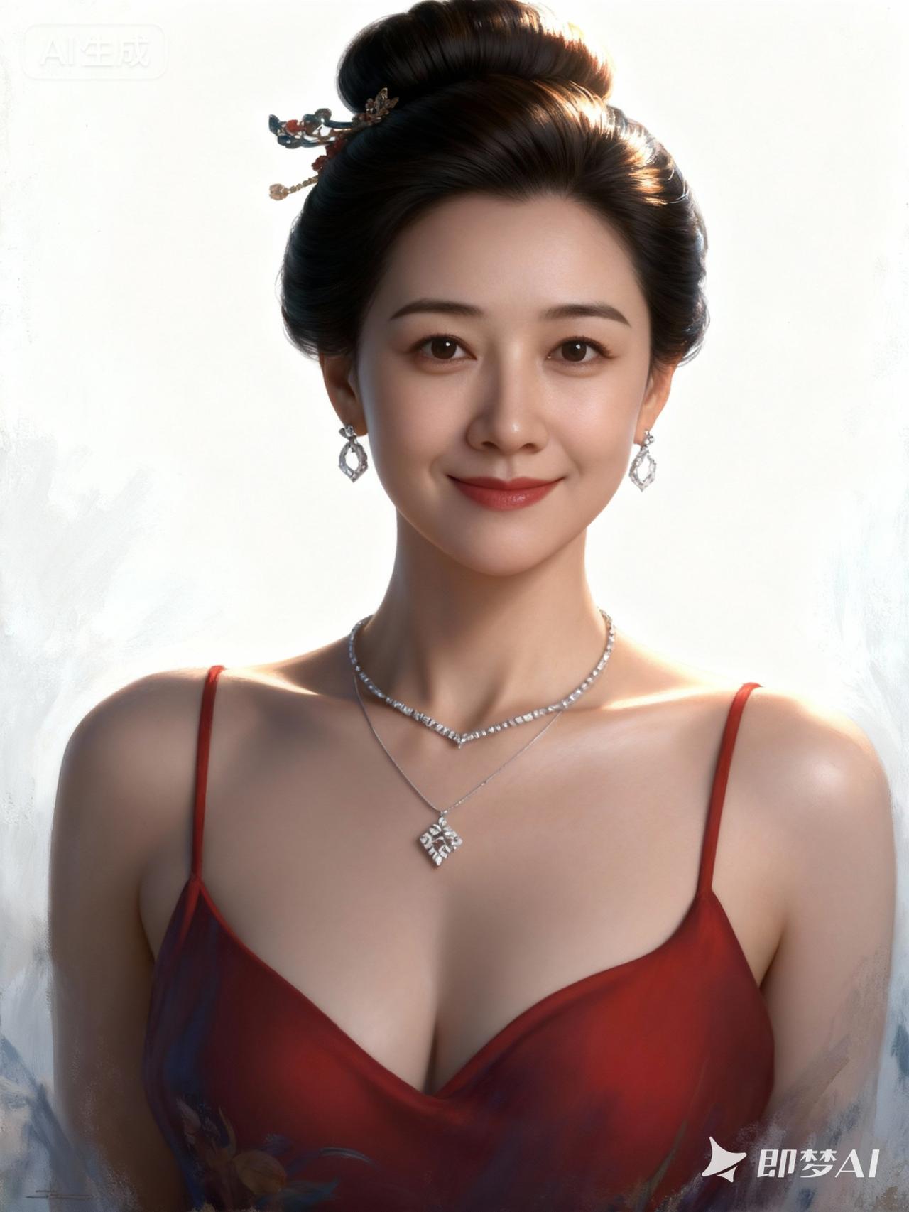 一个女人,精致妆容,眼尾细长,长的睫毛,慵懒蓬松盘发,两侧散落发丝,白色微露肩毛