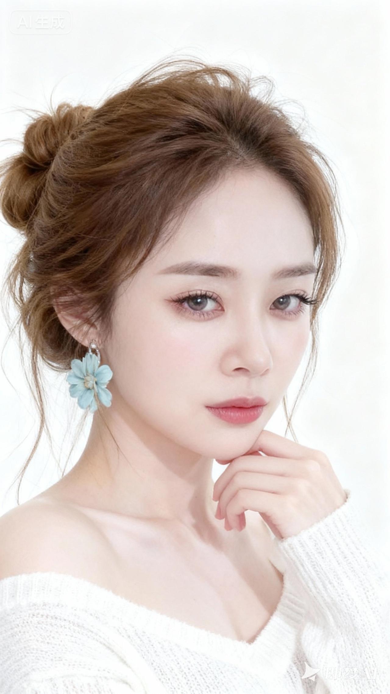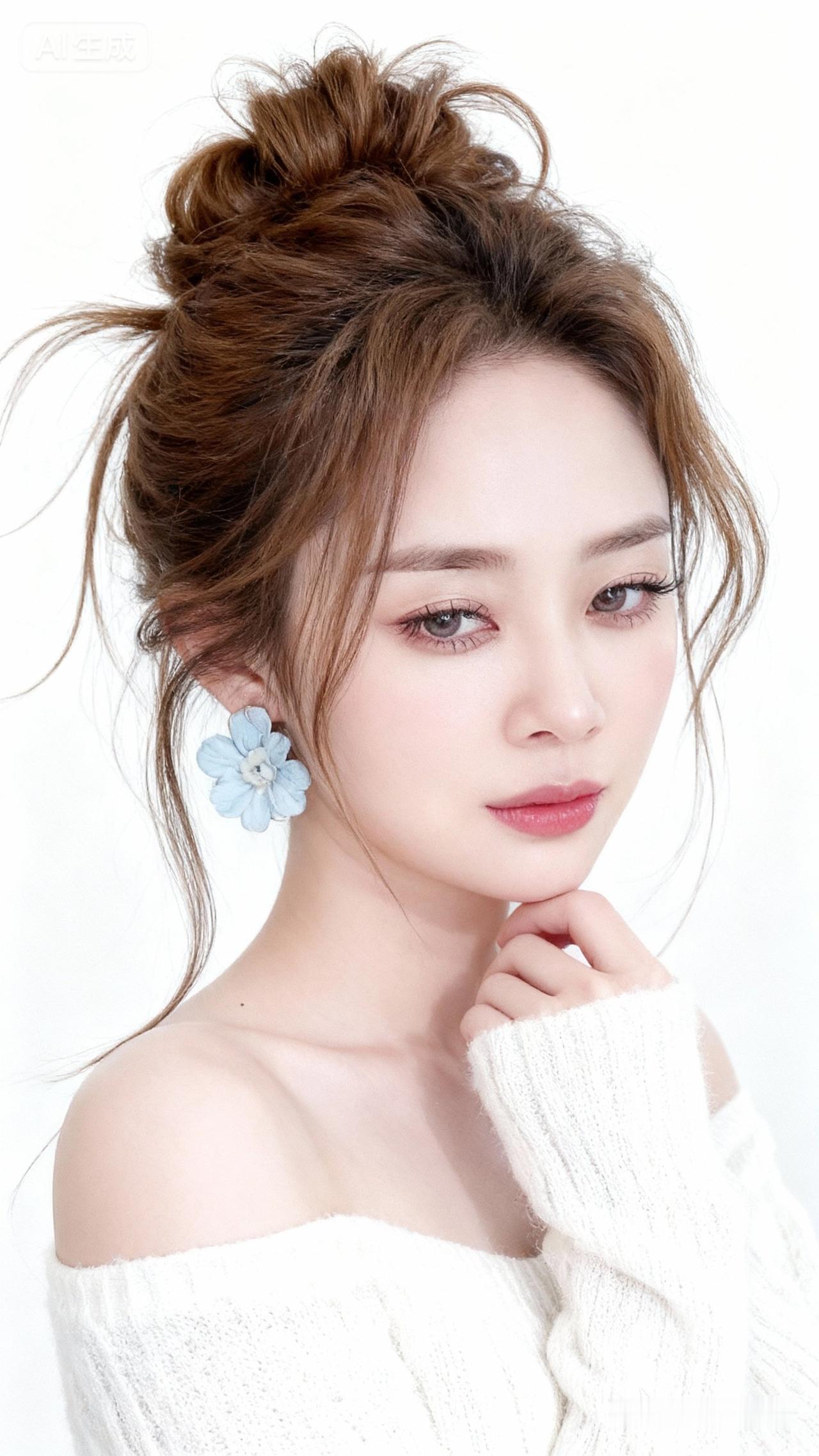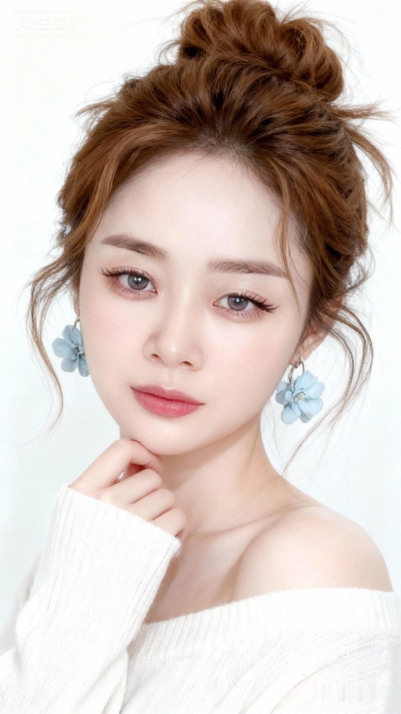 一个女人,精致妆容,眼尾细长,长的睫毛,慵懒蓬松盘发,两侧散落发丝,白色微露肩毛衣上衣,浅蓝花朵大耳环,唯美