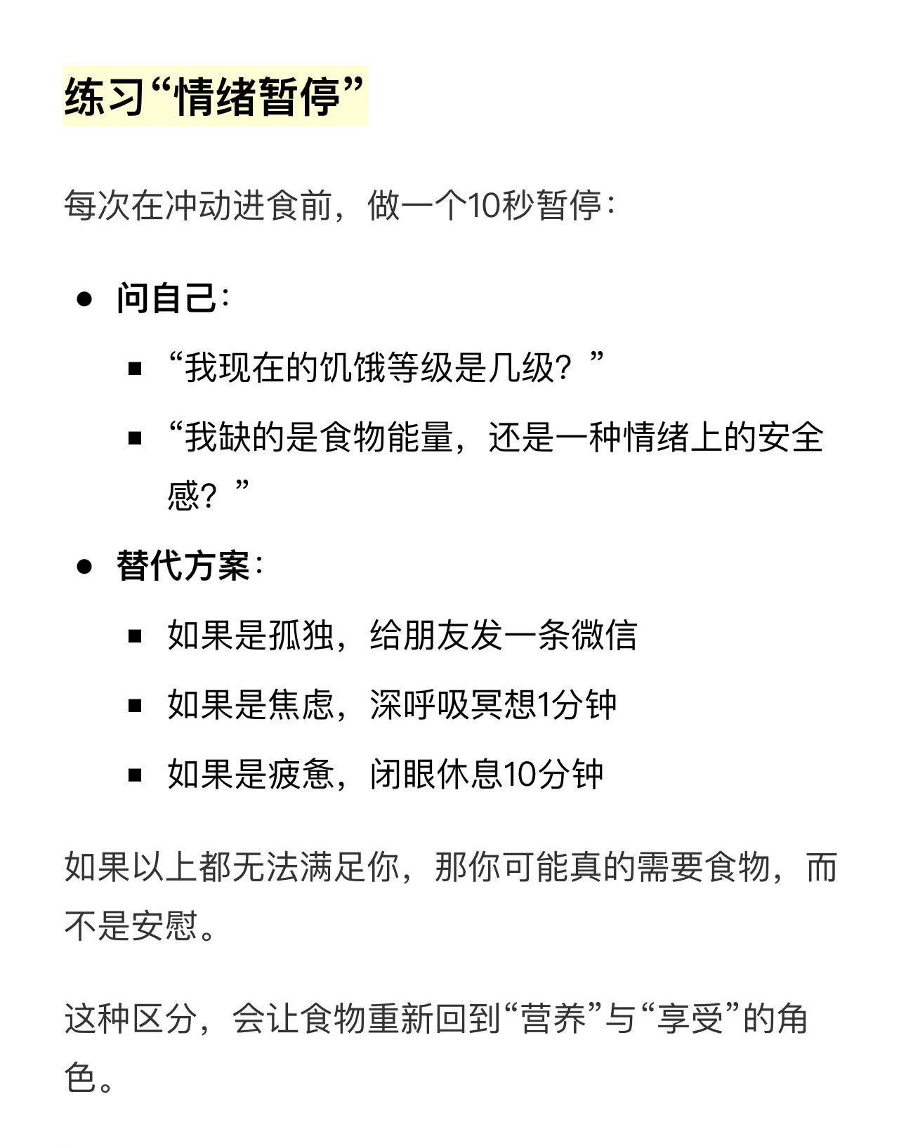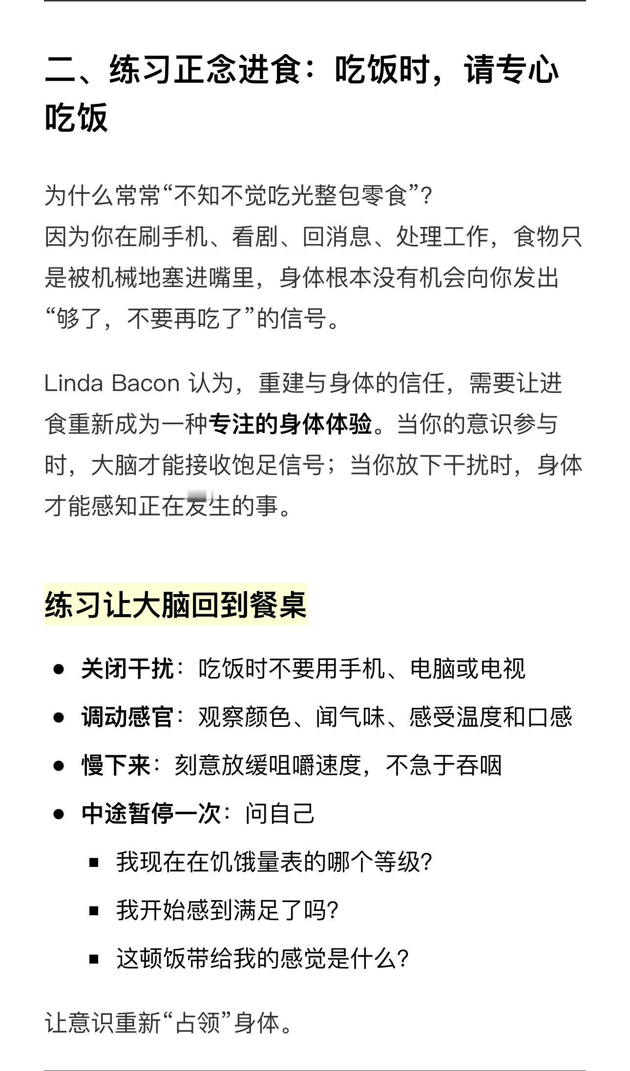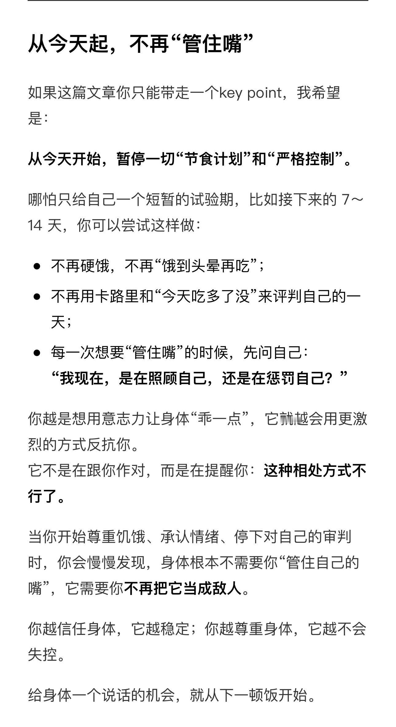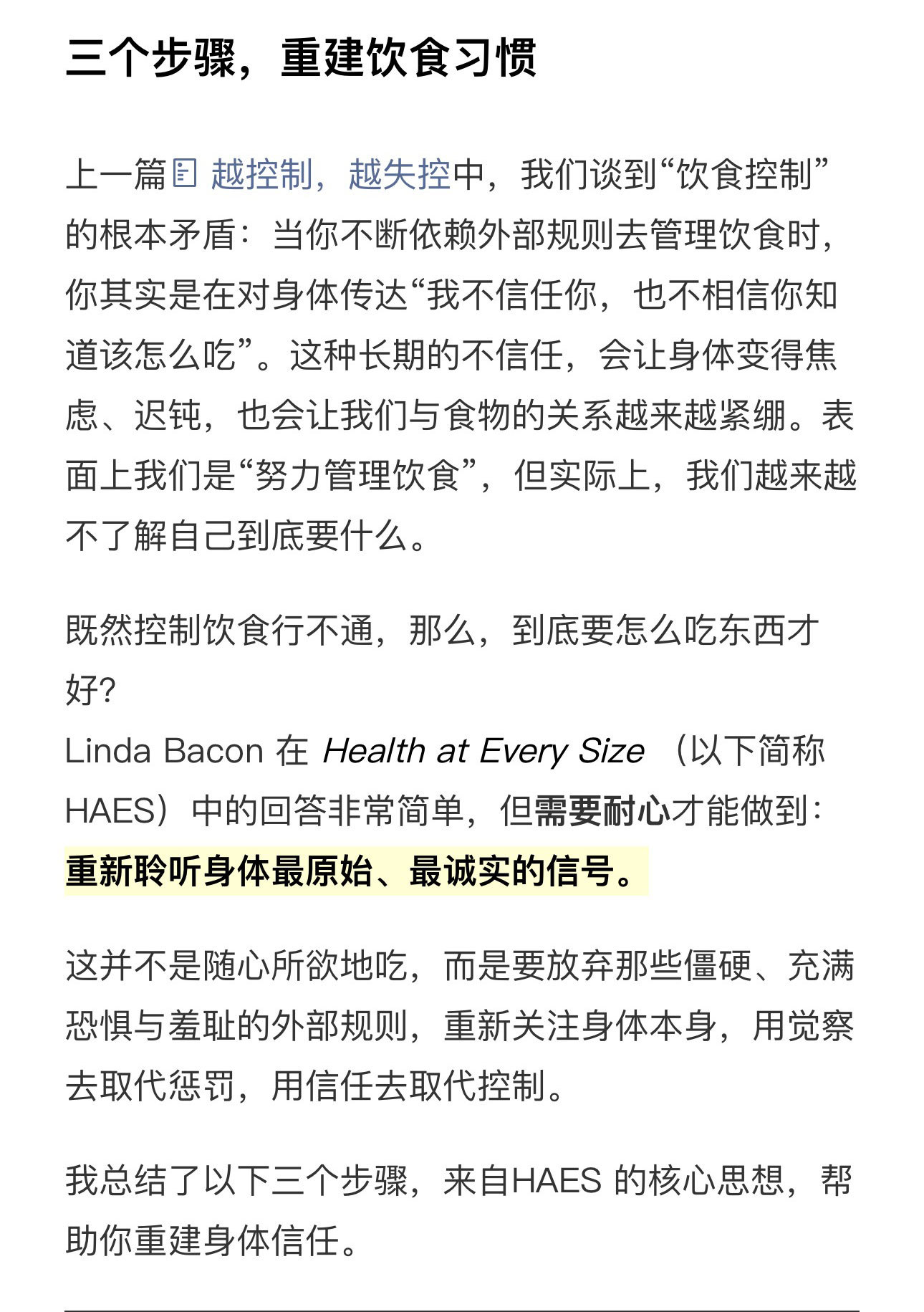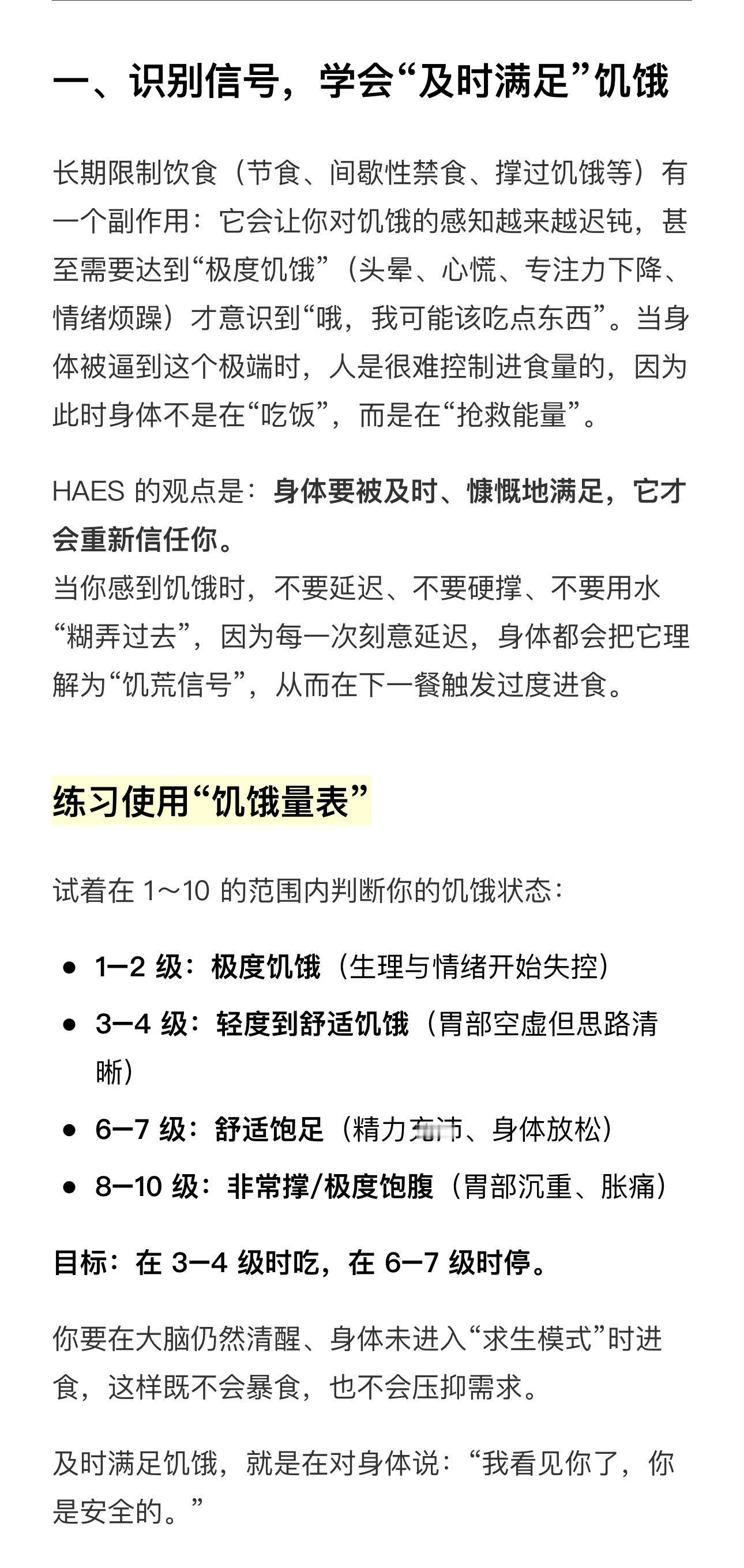 3个步骤重建饮食习惯 上一篇董老师的文章科普「越控制,越失控」中,谈到“饮食控制”的根本矛盾:当你不断依赖外部规则去管理饮食时,你其实是在对身体传达“我不信任你,也不相信你知道该怎么吃”。这种长期的不信任,会让身体变得焦虑、迟钝,也会让我们与食物的关系越来越紧绷。表面上我们是“努力管理饮食”,但实际上,我们越来越不了解自己到底要什么。既然控制饮食行不通,那么,到底要怎么吃东西才好?Linda Bacon 在 Health at Every Size (以下简称HAES)中的回答非常简单,但需要耐心才能做到:重新聆听身体最原始、最诚实的信号。这并不是随心所欲地吃,而是要放弃那些僵硬、充满恐惧与羞耻的外部规则,重新关注身体本身,用觉察去取代惩罚,用信任去取代控制。我总结了以下三个步骤,来自HAES 的核心思想,帮助你重建身体信任。一、【识别信号,学会“及时满足”饥饿】长期限制饮食(节食、间歇性禁食、撑过饥饿等)有一个副作用:它会让你对饥饿的感知越来越迟钝,甚至需要达到“极度饥饿”(头晕、心慌、专注力下降、情绪烦躁)才意识到“哦,我可能该吃点东西”。当身体被逼到这个极端时,人是很难控制进食量的,因为此时身体不是在“吃饭”,而是在“抢救能量”。HAES 的观点是:身体要被及时、慷慨地满足,它才会重新信任你。当你感到饥饿时,不要延迟、不要硬撑、不要用水“糊弄过去”,因为每一次刻意延迟,身体都会把它理解为“饥荒信号”,从而在下一餐触发过度进食。✅练习使用“饥饿量表”试着在 1~10 的范围内判断你的饥饿状态:1–2 级:极度饥饿(生理与情绪开始失控)3–4 级:轻度到舒适饥饿(胃部空虚但思路清晰)6–7 级:舒适饱足(精力充沛、身体放松)8–10 级:非常撑/极度饱腹(胃部沉重、胀痛)目标:在 3–4 级时吃,在 6–7 级时停。你要在大脑仍然清醒、身体未进入“求生模式”时进食,这样既不会暴食,也不会压抑需求。及时满足饥饿,就是在对身体说:“我看见你了,你是安全的。”二、【练习正念进食:吃饭时,请专心吃饭】为什么常常“不知不觉吃光整包零食”?因为你在刷手机、看剧、回消息、处理工作,食物只是被机械地塞进嘴里,身体根本没有机会向你发出“够了,不要再吃了”的信号。Linda Bacon 认为,重建与身体的信任,需要让进食重新成为一种专注的身体体验。当你的意识参与时,大脑才能接收饱足信号;当你放下干扰时,身体才能感知正在发生的事。✅练习让大脑回到餐桌关闭干扰:吃饭时不要用手机、电脑或电视调动感官:观察颜色、闻气味、感受温度和口感慢下来:刻意放缓咀嚼速度,不急于吞咽中途暂停一次:问自己——我现在在饥饿量表的哪个等级?——我开始感到满足了吗?——这顿饭带给我的感觉是什么?让意识重新“占领”身体。三、【区分“真实饥饿”与“情绪饥饿”】上一篇文章说过:情绪性进食不是饮食问题,而是照顾自己的问题。当你想吃东西时,你可以先问问自己:“我现在是需要食物,还是需要安慰?”也就是判断这是身体饥饿,还是情绪饥饿。身体饥饿是缓慢升起的。它会先从胃部的轻微空虚感开始,然后注意力变得有点涣散,你会自然想到“我该吃东西了”。在这个时候,几乎任何正常的一餐都可以满足你:饭、面、沙拉、鸡蛋、粥……都行。当你吃到一个“舒服的饱足感”时,饥饿就结束了,你会感到安定、有能量、头脑清晰。而情绪饥饿完全不是这样。它来得突然、急迫,是一种“我现在立刻要吃××”的强烈冲动。你不会想吃正餐,而是想吃某样特定的食物,比如冰淇淋、炸鸡、奶茶、巧克力、薯片等等。还有一个很好辨认的地方:身体饥饿在吃饱后会自然消退;情绪饥饿不会。即使胃已经满了,那种“我还想再吃点什么”的冲动仍然存在。身体饥饿会带来满足与能量;情绪饥饿则常常带来愧疚与自责。✅练习“情绪暂停”每次在冲动进食前,做一个10秒暂停:问自己:“我现在的饥饿等级是几级?”“我缺的是食物能量,还是一种情绪上的安全感?”替代方案:如果是孤独,给朋友发一条微信如果是焦虑,深呼吸冥想1分钟如果是疲惫,闭眼休息10分钟如果以上都无法满足你,那你可能真的需要食物,而不是安慰。这种区分,会让食物重新回到“营养”与“享受”的角色。【从今天起,不再“管住嘴”】如果这篇文章你只能带走一个key point,我希望是:✅从今天开始,暂停一切“节食计划”和“严格控制”。哪怕只给自己一个短暂的试验期,比如接下来的 7~14 天,你可以尝试这样做:不再硬饿,不再“饿到头晕再吃”;不再用卡路里和“今天吃多了没”来评判自己的一天;每一次想要“管住嘴”的时候,先问自己:“我现在,是在照顾自己,还是在惩罚自己?”你越是想用意志力让身体“乖一点”,它就越会用更激烈的方式反抗你。它不是在跟你作对,而是在提醒你:这种相处方式不行了。当你开始尊重饥饿、承认情绪、停下对自己的审判时,你会慢慢发现,身体根本不需要你“管住自己的嘴”,它需要你不再把它当成敌人。你越信任身体,它越稳定;你越尊重身体,它越不会失控。给身体一个说话的机会,就从下一顿饭开始。cr.董懂动(董老师)健闻登顶计划 运动康复