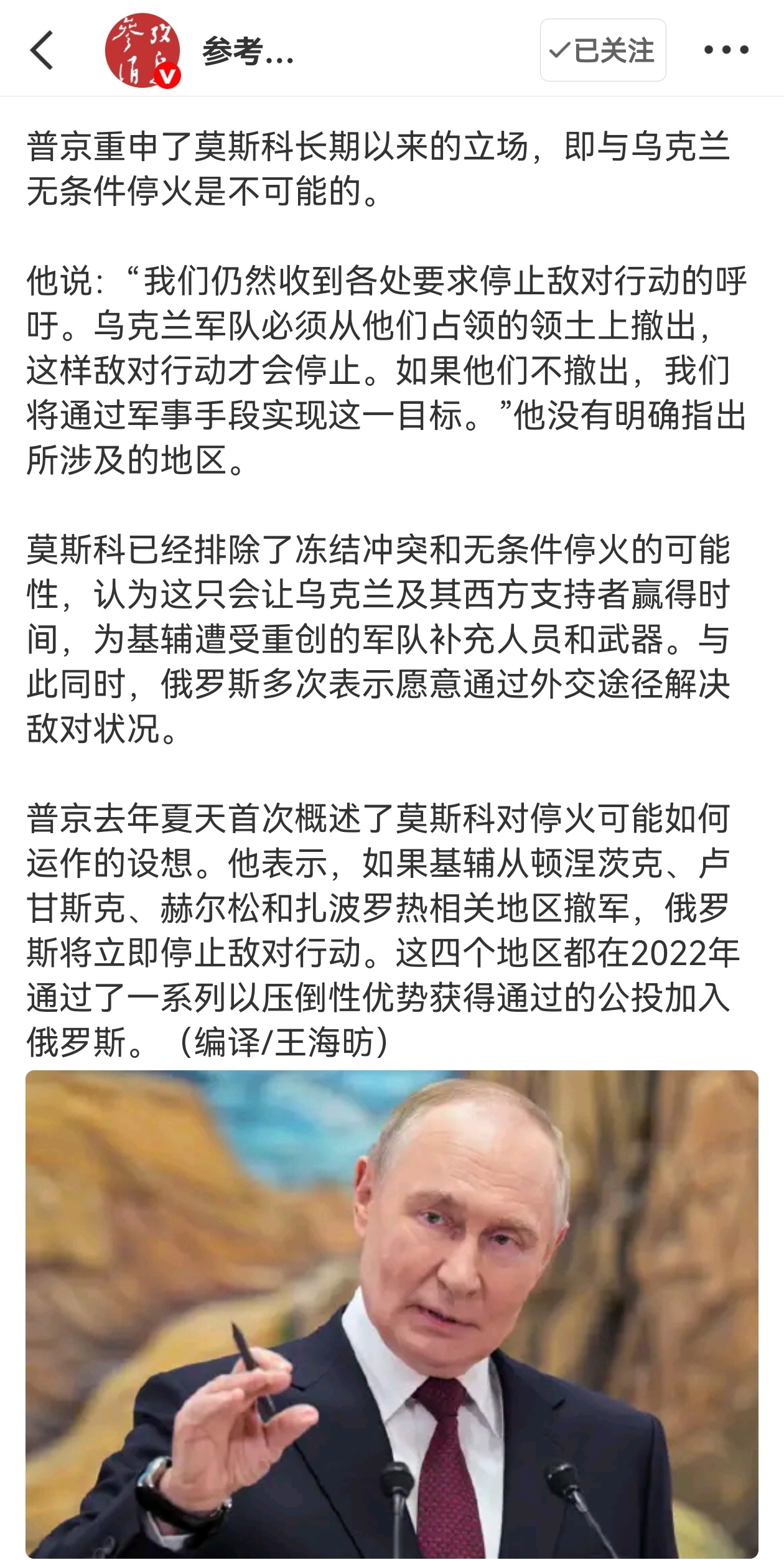 普京宣布与乌克兰停火条件 现在早已经不是俄乌之间冲突,而是美欧与俄罗斯之间的问题。面子里子没得到之前,那帮政客和大财团会一直讨价还价,拿不到就只能继续打,它们会认为反正流血的又不是它们!