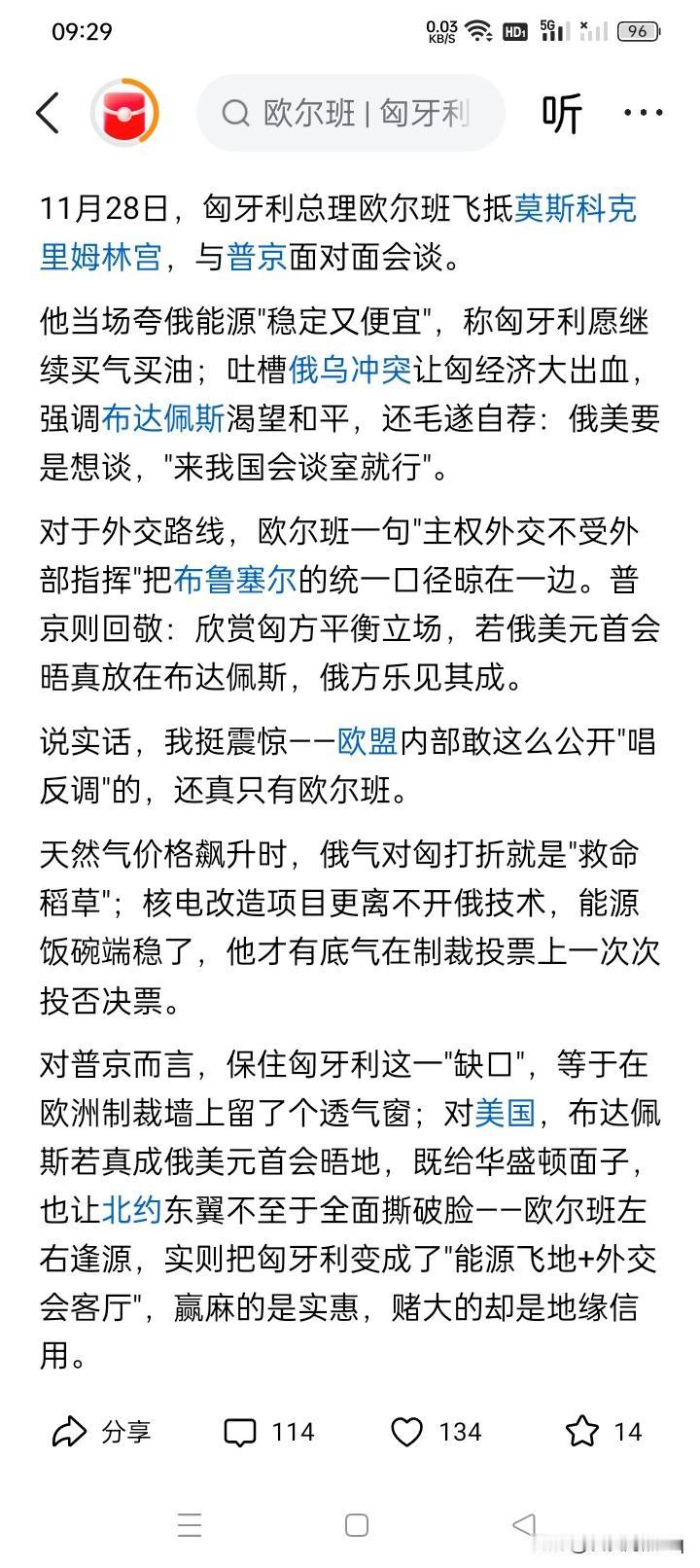 欧尔班精神可佳,但后果堪忧? 全世界的人都知道,目前俄罗斯对乌克兰的战争正处于打的难分难解的胶着时期,而且欧洲绝对大部分国家,可能都是支持和援助乌克兰的。特别是,匈牙利作为全球最大的军事联盟——北约的同盟国,以及欧洲仍至全世界最大的政治和经济联盟——欧盟的成员国,他们组织的领导层又似乎也都是支持和援助乌克兰的。 这次欧尔班率领匈牙利政府代表团浩浩荡荡奔赴俄罗斯,欧尔班的胆量确实令人为之动容。匈牙利是欧洲一个缺油少气的内陆国家,迫切需要俄罗斯廉价石油和天然气。但目前的主要问题,并不是俄罗斯不向匈牙利提供石油、天然气,除了中断不能使用的油气管道,现在运输中需要通过的管道,仍然是需要通过别的国家境内,而通过好时候仍然好像是困难重重。而且,似乎美国对匈牙利进口俄罗斯油气的制裁的豁免,仅仅只有一年的时间。 因此,尽管欧尔班冒着得罪北约和欧盟的风险访问俄罗斯,然而,究竟能够起到多大作用,估计仍然扑朔迷离,可能是个巨大的未知数。