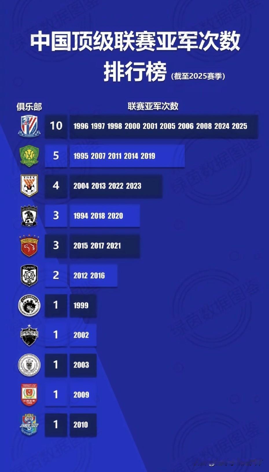 “千年老二”!花花这也算创造历史了。我想问这些年花花拿了这么多亚军,难道是不喜欢冠军吗? 话说这两年申花本来都有机会夺冠的,尤其今年,自己不争气赖不了别人,之前争冠形势多好,领先六分愣是连续好几场不胜,海港也翻过车但是给机会了把握不住啊,只能说一个国安一个申花,就没有冠军的命。 这么看国安和申花只能算是中超老牌劲旅,这三十年真正的中超豪门只有四个:大连、鲁能、恒大,海港。 冷知识:其实国安亚军可以算6个,因为02年甲A的亚军是抽签决定的,01年出了甲B五鼠事件,让足协决定在02年这1届比赛,出现2队同分,胜负关系和两场对战比分一样,就抽签决定名次,最终深圳和国安抽签决定亚军,深圳抽到了亚军。