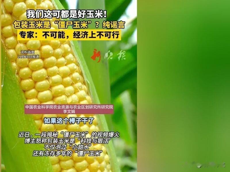 包装玉米是“僵尸玉米”?专家回应 近日有传言称,市面上的真空玉米、冷冻玉米不仅刷小甜水,还是冻了许多年的“僵尸玉米”。专家:不可能。
