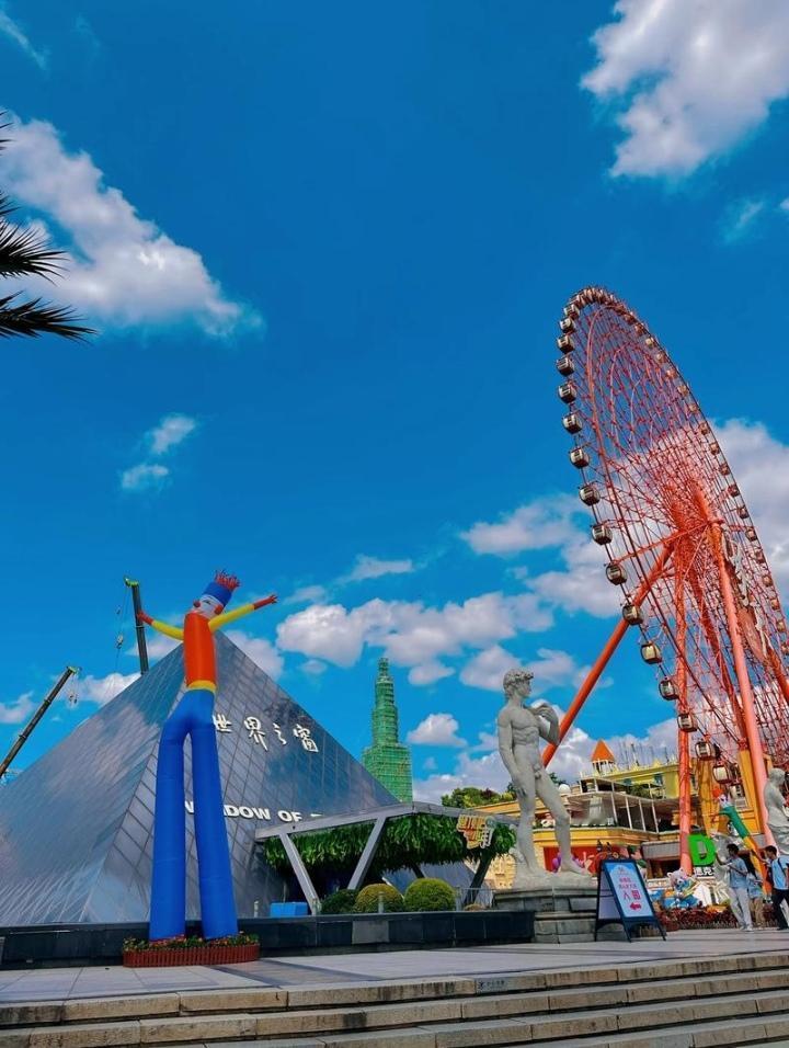 蓝天下的“世界之窗”太好啦!银灰金字塔建筑自带高级感,红架摩天轮转着浪漫,卡通充气人偶和大卫雕像撞出趣味,连风里都裹着快乐。