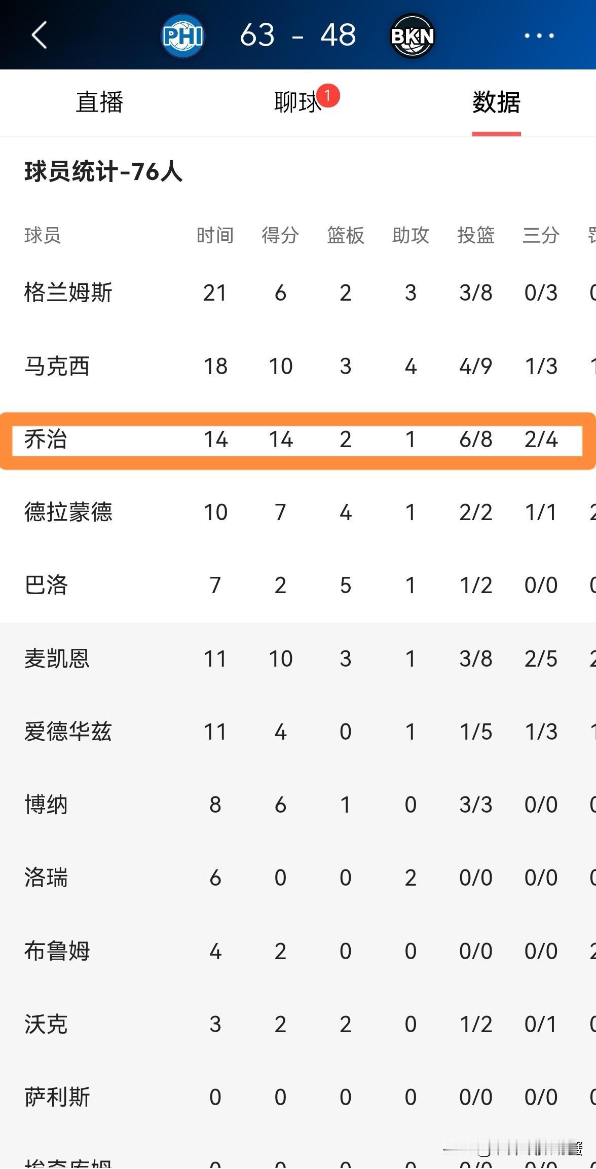 76人超级巨星乔治真是梦回巅峰!在今天76人客场挑战篮网的上半场比赛中,乔治大发神威在攻防两端都打出了无可挑剔的表现,他的精彩表现让人们再次领略了他巅峰时期的风采。 在前两节比赛中,乔治首发出战14分钟,投篮8中6,其中三分球4中2非常高效的砍下14分2篮板2抢断0失误0犯规,他的场上正负值为+14。 众所周知,在乔治的巅峰期,这样的表现对于乔治而言就是家常便饭。
