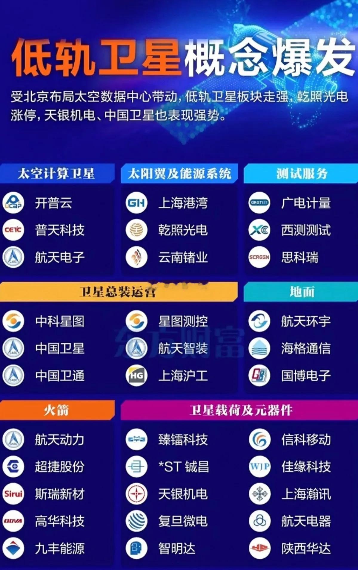 低轨卫星:概念股爆发!受北京布局太空数据中心带动,低轨卫星板块走强,乾照光电涨停,天银机电、中国卫星也表现强势。