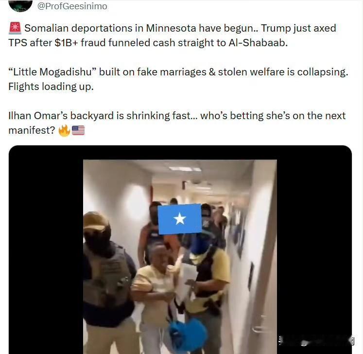 明尼苏达州的索马里人遣返行动已经开始……特朗普取消了临时保护身份(TPS),因为超过10亿美元的欺诈资金直接流入了青年党。 伊尔汗·奥马尔的“后院”正在不断缩小……谁敢打赌,她不会出现在下一班航班的名单上?
