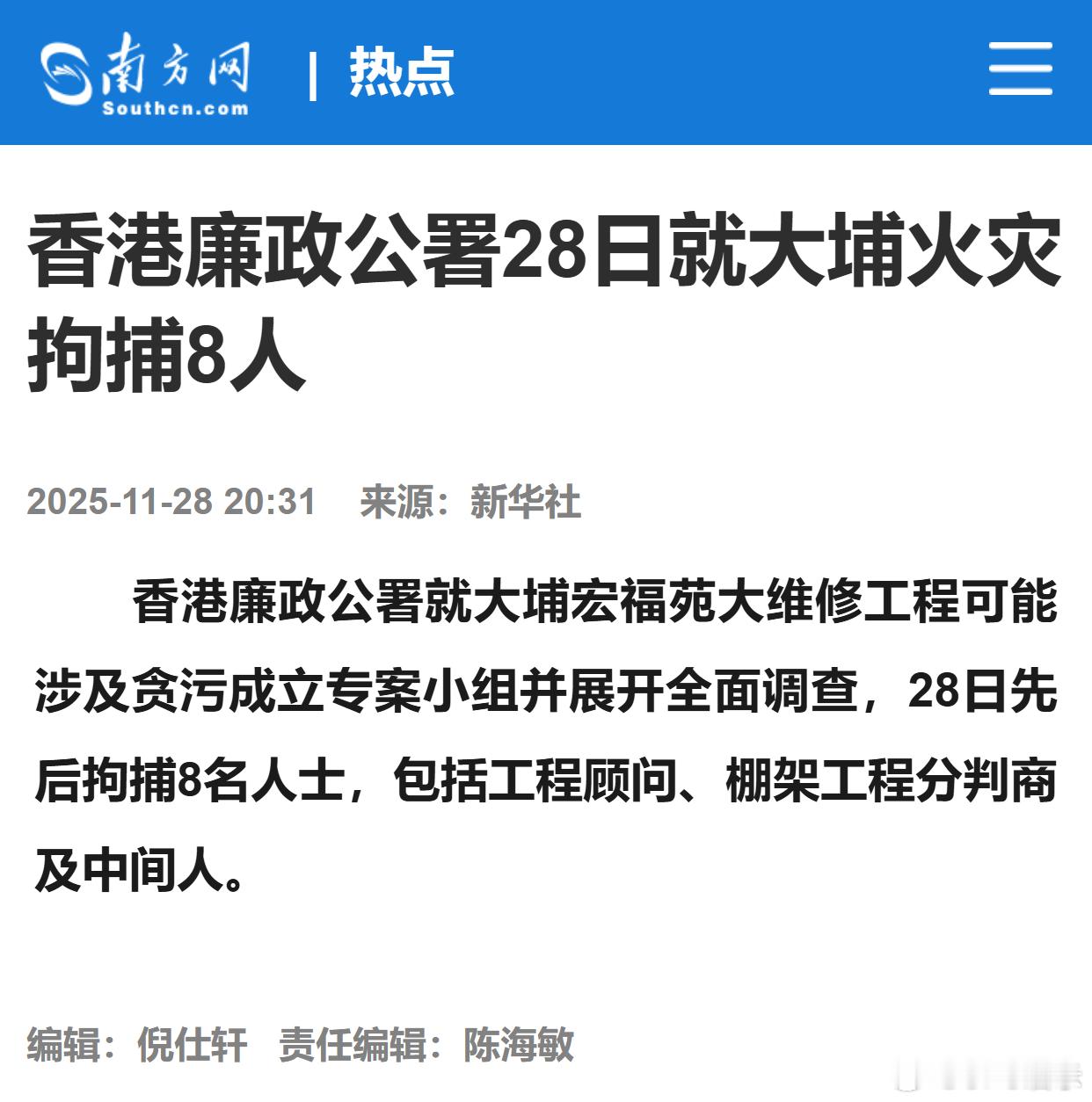 香港廉政公署28日就大埔火灾拘捕8人