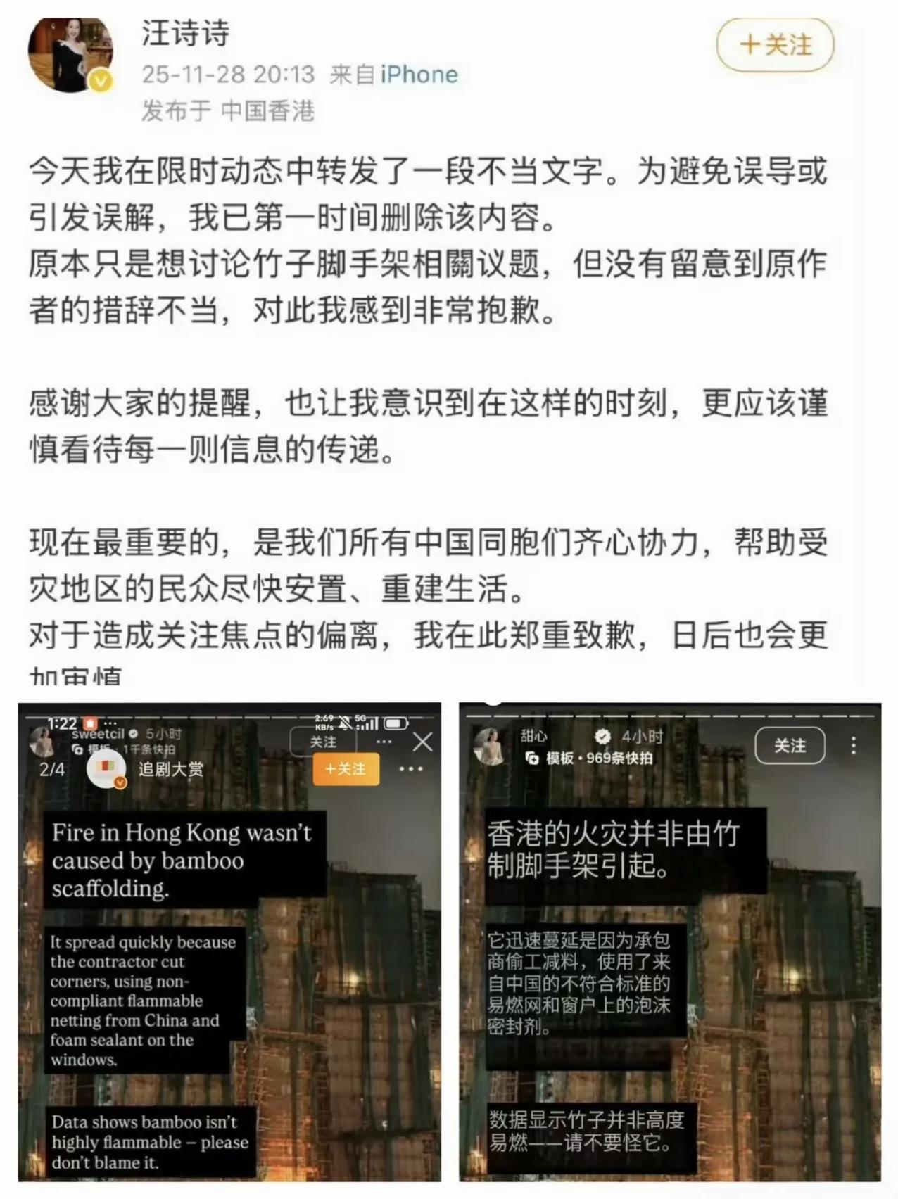 在香港大火捐款潮中,甄子丹老婆却借此污蔑说火灾原因并非竹子,而是使用了中国的伪劣产品? 谴责声出来后,她感到后怕了,忙发文道歉,说自己转发了不当言论。 其实这个事至少暴露了两点: 一是她或她的家人极有可能和竹子协会有牵连,这个节骨眼上,只有经济利益才会让人不计后果的制造舆论祸水东移。 二是分不清家国轻重,或者说暴露了内心对于国家的定位。这种污蔑坏的很,其心可诛。 至于当下的道歉,不是悔了,而是怕了。针对这种劣迹,一定要正视起来,让那些吃锅里尿锅里的知道犯错的代价!
