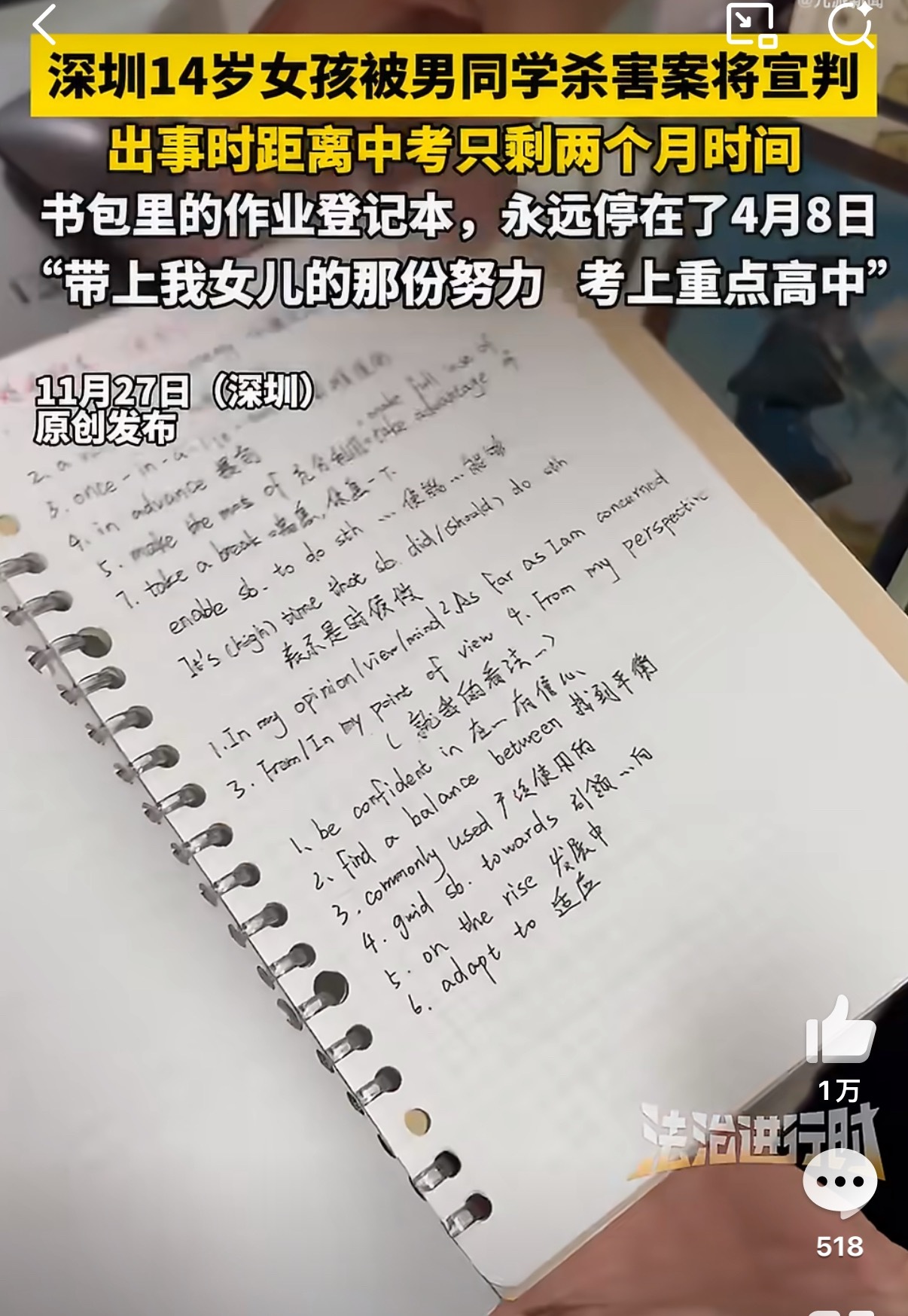 看到优优写满知识点的笔记本,再看凶手的所作所为,只觉得寒意透骨。这个14岁男生的恶,是“精心计算”过的:提前搜未成年人犯罪的法律后果、网购刀具甚至试图买毒药,连捅26刀后还补刺要害——他不是一时冲动,是带着“规避惩罚”的心思,处心积虑要夺走一条鲜活的生命。更让人窒息的是“恩将仇报”:优优家三年免费接送他上下学,他却因嫉妒对方的优秀与善意,把这份温暖变成了刺向女孩的刀,事后还撒谎狡辩、毫无悔意。法律判了无期,可那个认真登记作业、期待中考的女孩,再也等不到重点高中的录取通知书了。这哪里是“孩子犯错”?是披着未成年外壳的恶意,在毁掉一个家庭的全部希望。愿优优的努力被带着奔赴考场,也愿这份血的教训,能让“未成年人”不再是恶意的护身符。