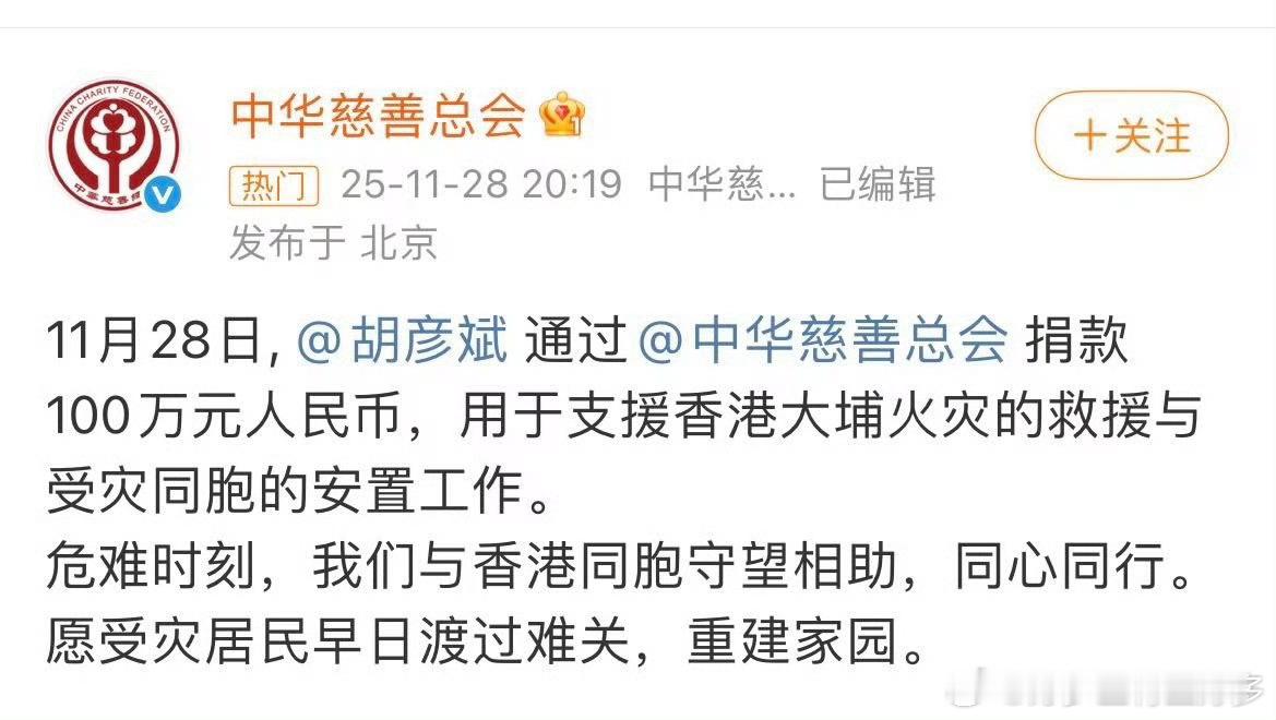 胡彦斌驰援香港共渡难关 暖心驰援!胡彦斌通过中华慈善总会捐100万支援香港大埔火灾安置,不造势不张扬的默默行动,彰显同胞守望之情,这份不动声色的善意太戳人~