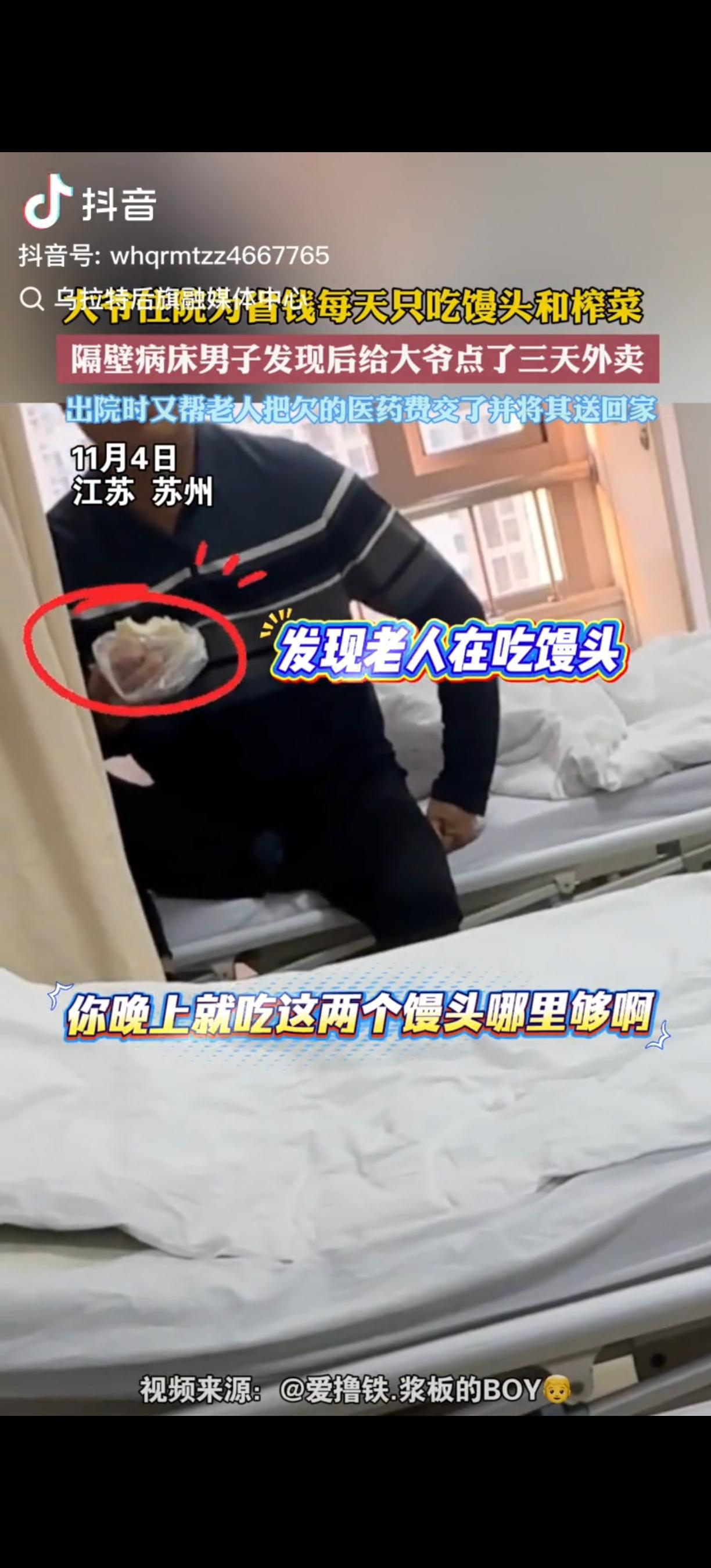 江苏一男子生病住院,见邻床床老人只吃白馒头和榨菜,男子以为老人生病只能吃这个,没想到,次日,午饭时老人又在吃!得知原因后,男子给老人点了外卖,怕老人拒绝谎称多点了一份,接下来男子的做法令网友感动不已。 男子因身体不适住进了医院,顺便把身体都检查个遍。住院期间,他发现邻床有个大爷每天都只吃白馒头就着榨菜,一开始以为是老人病情特殊,只能吃这些清淡的。 直到第二天中午,这位大爷又拿出了白馒头和榨菜,男子忍不住问了问。大爷叹了口气说,自己家里条件不好,住院的费用都是东拼西凑的,实在舍不得花钱买别的吃。 男子听了心里很不是滋味,他悄悄点了一份外卖,等外卖到了,他跟张大爷说:“大爷,我点多了一份,吃不完,您帮我吃点吧。”张大爷一开始还不好意思,在小陈的再三劝说下才收下。 接下来的三天,男子每天都多点一份外卖,变着花样给张大爷改善伙食。他还细心地帮大爷把外卖里的辣椒挑出来,就怕老人吃了不舒服。 到了出院这天,男子得知大爷还欠着医药费,二话没说就帮他把医药费交了,还开车把大爷送回了家。大爷一路上不停地道谢,眼里泛起了泪光。 这事传到网上,网友们纷纷点赞。有人说小陈善良又细心,照顾到了老人的自尊心;也有人说,希望社会上能多一些这样的温暖。小陈却觉得没什么,他说谁都有难处的时候,能帮一把就帮一把。 各位读者你们怎么看?欢迎在评论区讨论。 来源:乌拉特后旗融媒体中心 2025-11-4消息