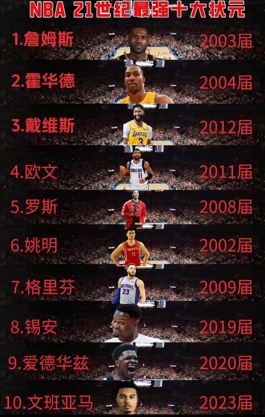 NBA 21世纪最强十大状元 榜单: 1 詹姆斯 2003 4次总冠军+4次FMVP+4次MVP,历史总得分王,NBA生涯22赛季仍保持高水准 2 霍华德 2004 1次总冠军+3次DPOY(最佳防守球员)+篮板/盖帽王,曾率魔术进总决赛 3 戴维斯 2012 1次总冠军,攻防全能型内线,多次入选最佳阵容 4 欧文 2011 1次总冠军,2016年关键三分夺冠,顶级单打得分手 5 罗斯 2008 最年轻常规赛MVP(22岁),巅峰期以“变向不减速”著称 6 姚明 2002 首位外籍状元,8次全明星+5次最佳阵容,推动NBA在亚洲的影响力 7 格里芬 2009 暴力扣篮代表,出道即巅峰,曾入选最佳阵容 8 锡安 2019 身体素质炸裂的内线得分手,但伤病影响出勤 9 爱德华兹 2020 攻守全能的新生代得分手,森林狼核心球员 10 文班亚马 2023 新秀赛季即获盖帽王+防守一阵,2025年场均3.8盖帽,
