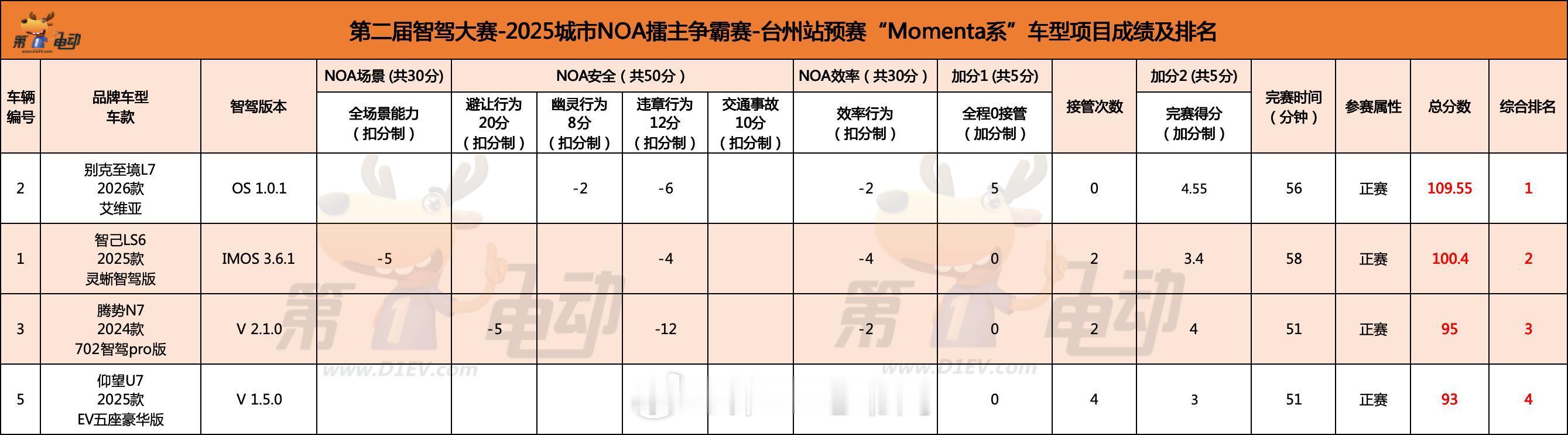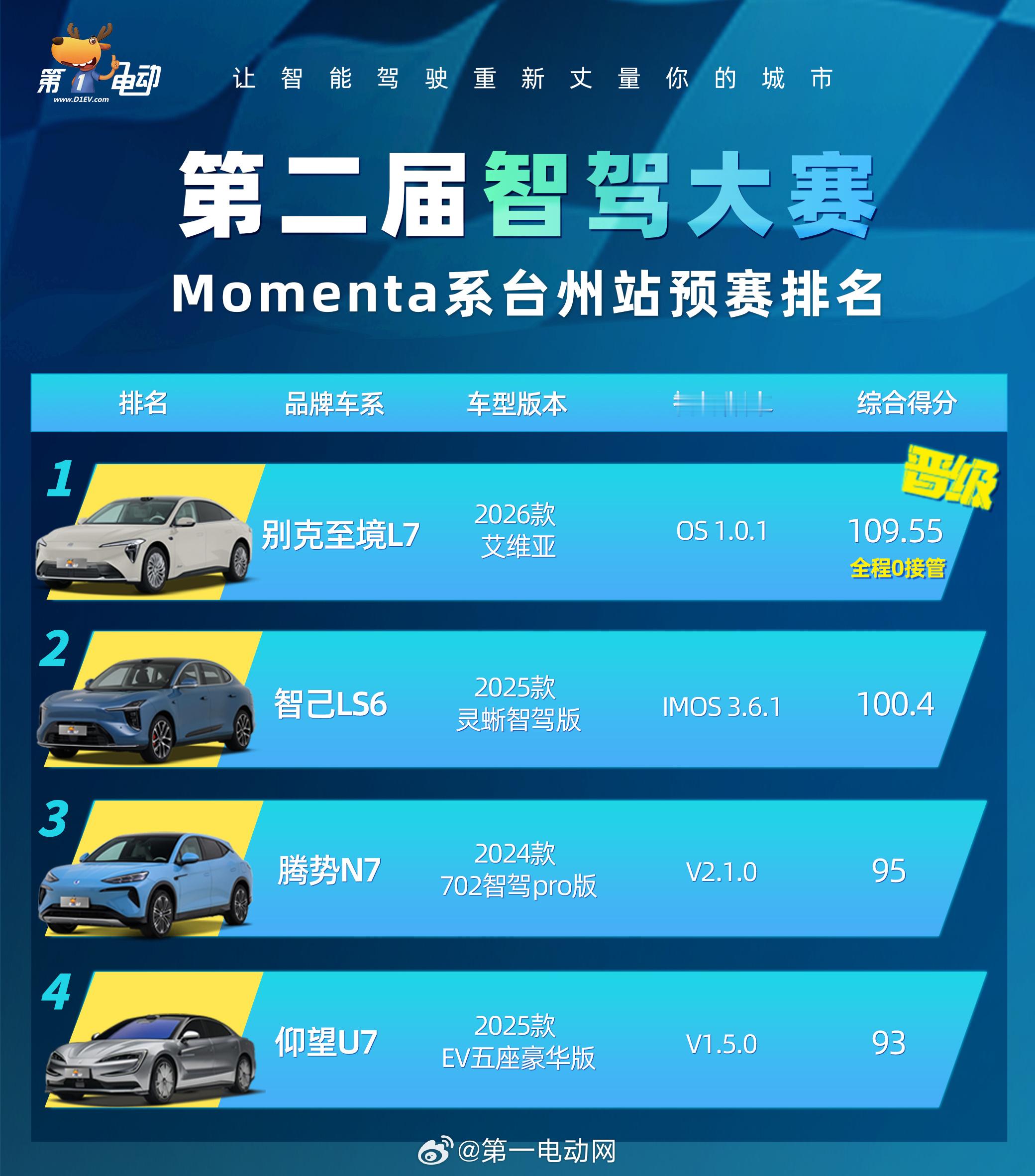 第二届中国智驾大赛第二届中国智驾大赛台州站 别克至境L7 总分109.55分 智己LS6 100.4分 腾势N7 95分,仰望U7 93分,恭喜别克至境L7 晋级决赛,Momenta R6飞轮大模型祝贺! 明天决赛继续加油!